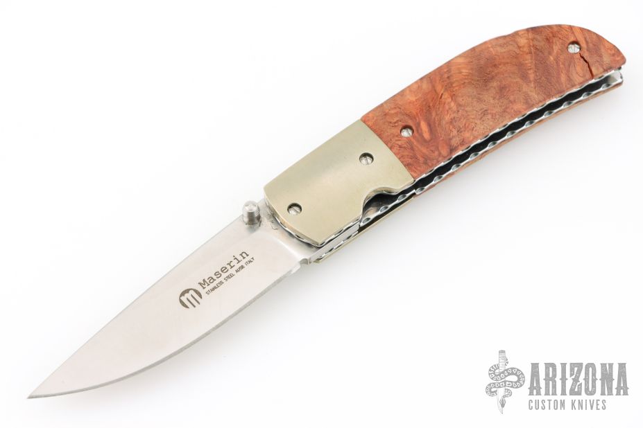 This linerlock folder by Maserin features a satin finished blade with a single thumb stud. The handle features satin anodized bolsters, wood covers, and file worked liners. Nice detent, lock up and blade seating. Comes with original box, papers, and leather pocket sheath. Excellent condition.