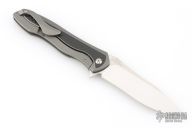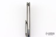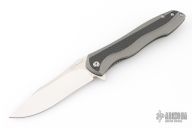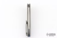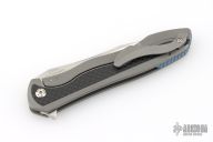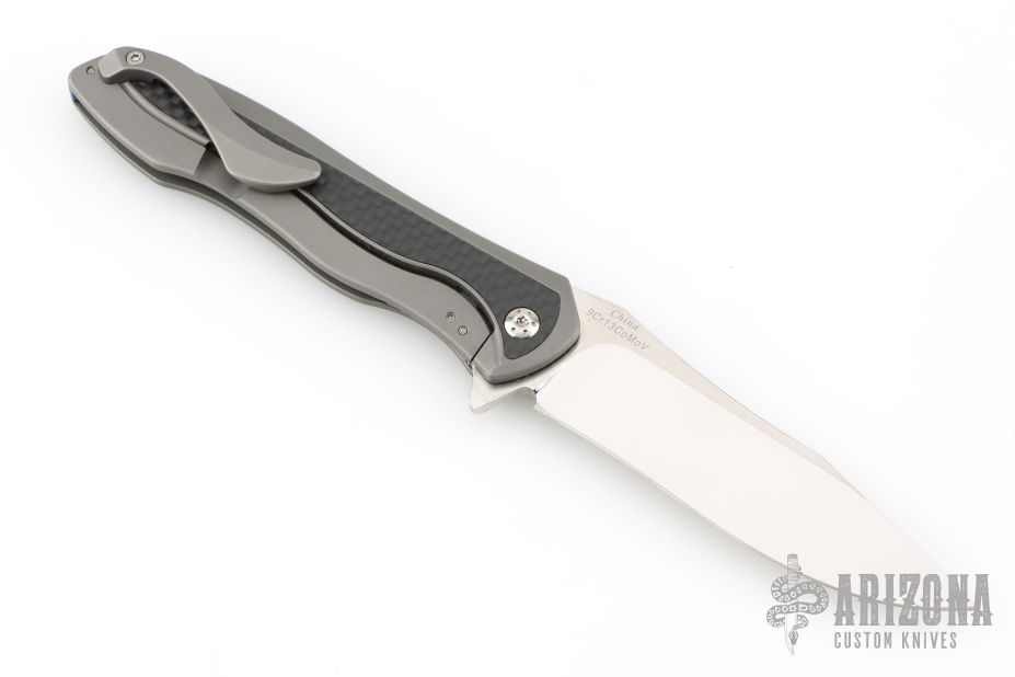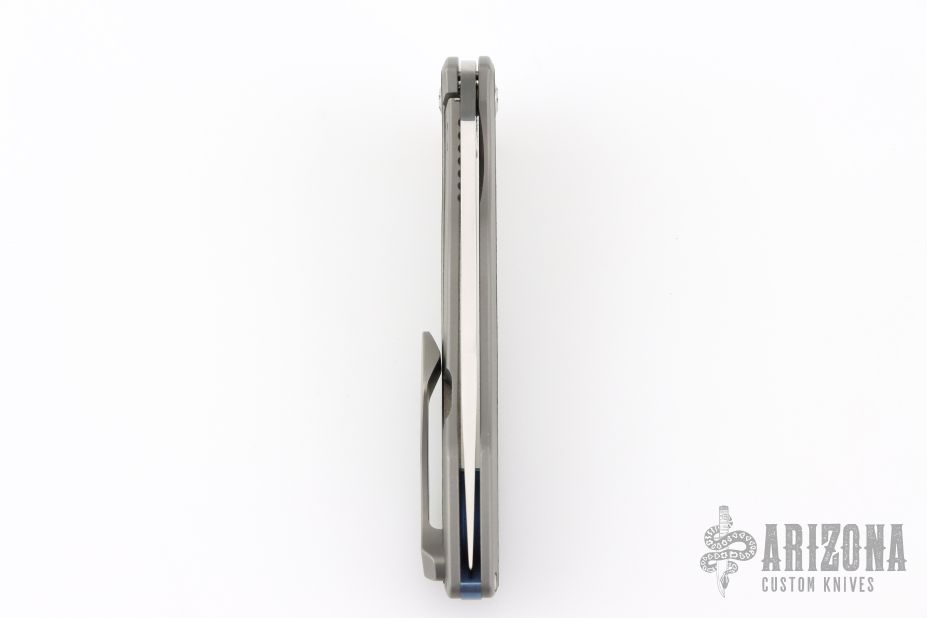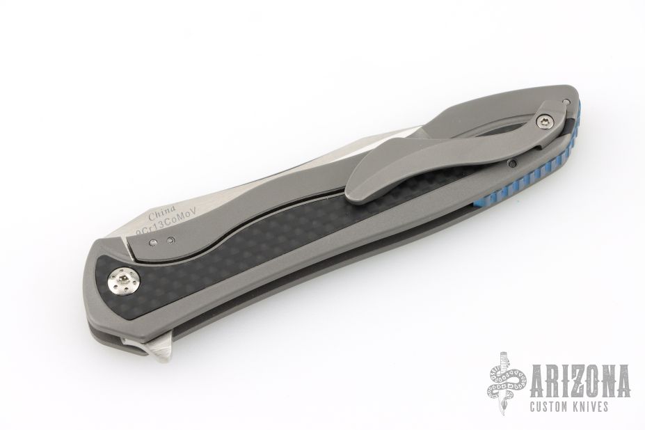 The 3-5⁄8" blade is a two-toned, mirror polished finish on the blade grind, and a satin finish on the flat surfaces. The clip point blade is 9Cr13CoMoV stainless at 58-60 Rc., a steel that we have found to take a fine edge, cut extremely well and hold that edge for a life long use. The flipper and bearings in the pivot make for easy one-handed opening. The handles are bead blasted Titanium with Carbon Fiber inlays. The deep-pocket clip is milled from a solid piece of titanium and is positioned for tip-up, right-handed carry. The back spacer is anodized a pale blue. Measures 4-5⁄8" closed. Weighs 3.1 oz. Made in China.
