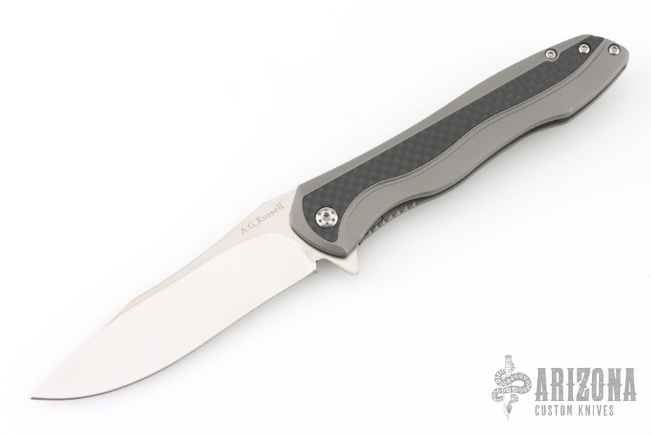 The word Sinuate (sin-yoo-it) means to curve or wind in and out. That certainly applies to the handle profile of this new A.G. Russell™ frame-lock folder. Those lines are repeated in the lower edge of the titanium handle, the lower edge of the carbon fiber handle inlay and the lines of the blade. Even in the lines of the milled titanium clip, creating a visually appealing and comfortable to use folder.