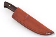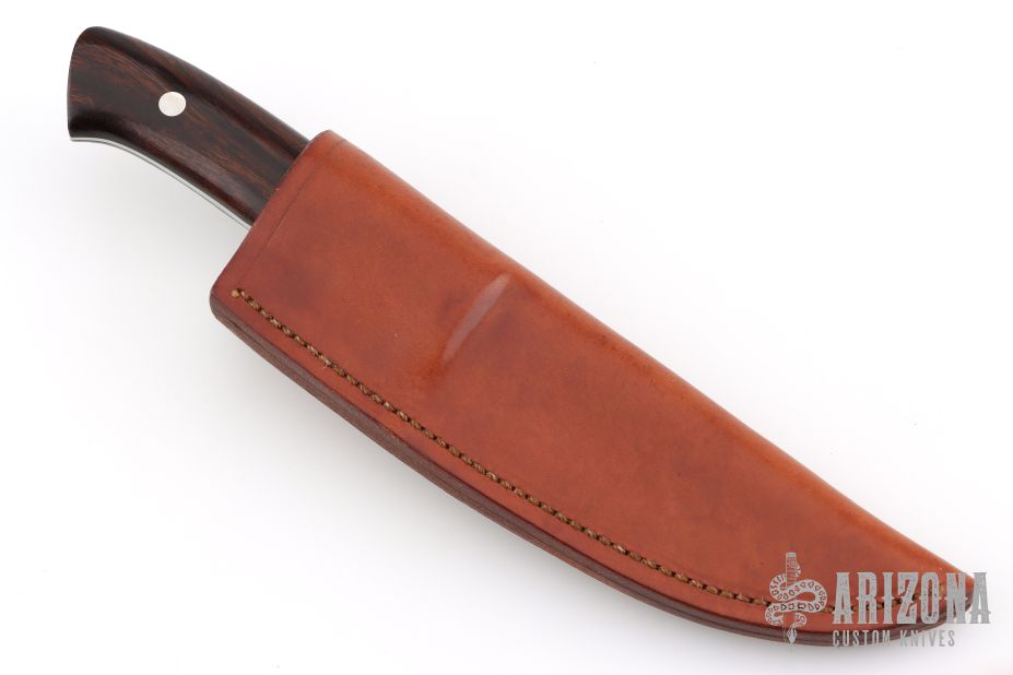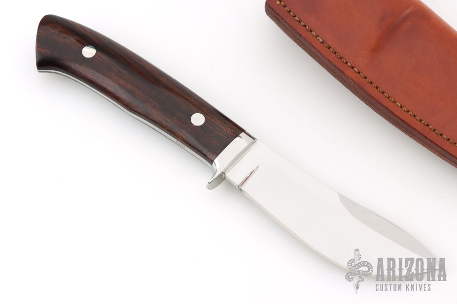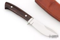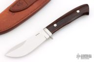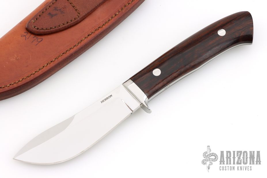 This Semi-Skinner by the late George Herron features a mirror polished upswept blade, .178" blade stock, 1.210" blade depth, full tapered tang construction. The handle has a stainless steel guard, red liners, and desert ironwood scales. Numbered 2179 on bottom of tang. Includes a brown leather sheath with 2179 on the back. Excellent condition.