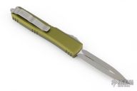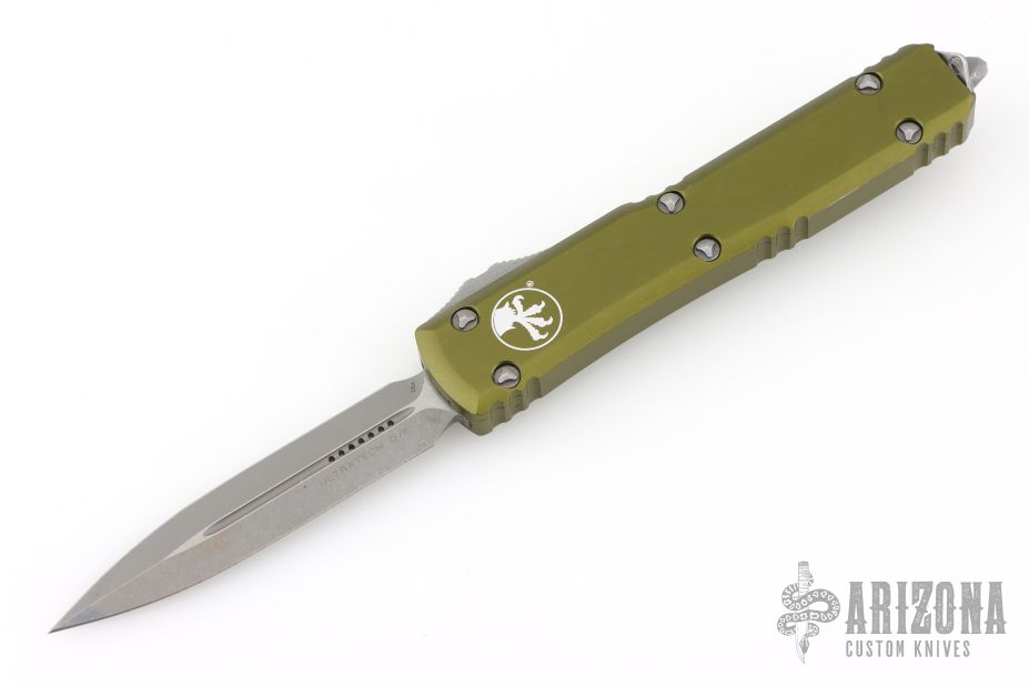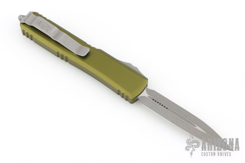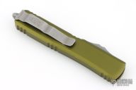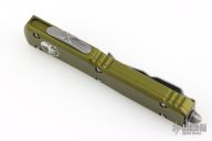 This Ultratech OTF automatic by Microtech knives features a D/E Apocalyptic blade with a standard edges, and an OD Green aluminum handle with Apocalyptic finished hardware and tip down clip. Glass breaker. S/N 270873. Dated 02/2023. Excellent Condition.