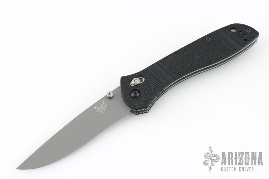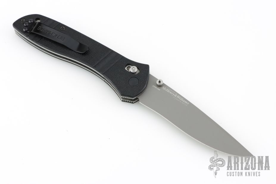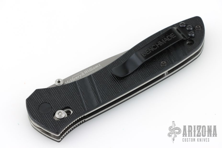 This Benchmade 710 McHenry & Williams has a bead blast finished blade with dual thumb studs. Handle is black G10 scales with milled ribs, stainless steel liners, and black stainless steel tip up clip. Comes with original box and papers. Excellent condition.