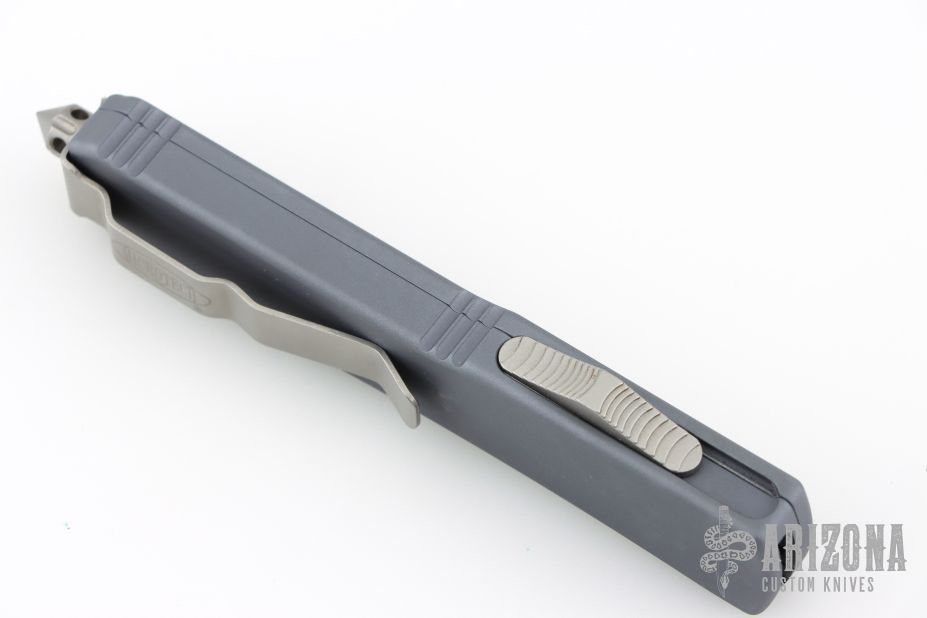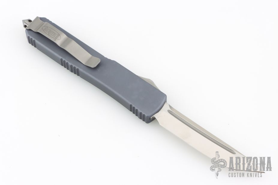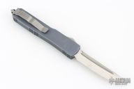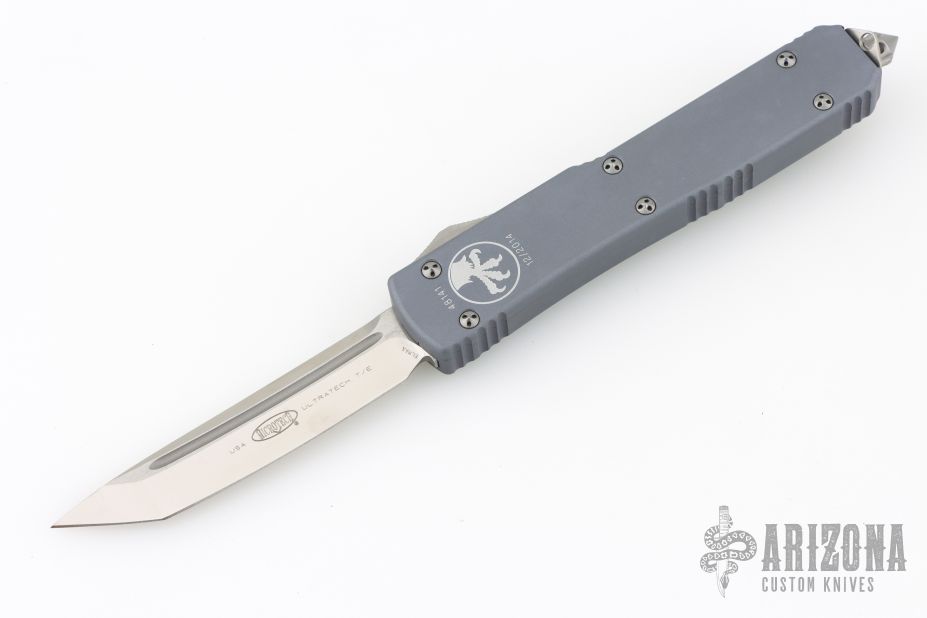 This Ultratech OTF automatic features a T/E stonewashed tanto blade with a standard edge. Grey aluminum handle with stainless steel clip. Glass breaker. Serial number 48141 and dated 12/2014. Comes with original box and papers. Has a couple really tiny scratches on the blade, otherwise excellent condition.