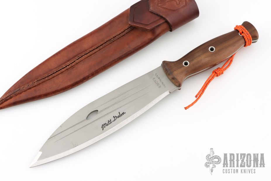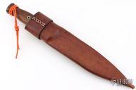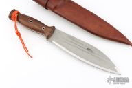 The Primitive Bush knife features an English 420 HC (High Carbon) surgical quality stainless steel and is heat treated and annealed to about 56-58 Rockwell (a measure of hardness). Every edge is hand finished and polished to razor sharpness. The blasted satin finish is achieved by sand or bead blasting the exposed metal portion of the blade. The hardwood handles are made from hard woods of Central America, similar to Hickory, and are used in some of our machetes and knives. They are finished with a smooth grip and are known for their long durability.