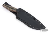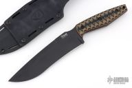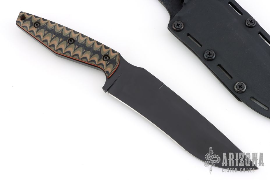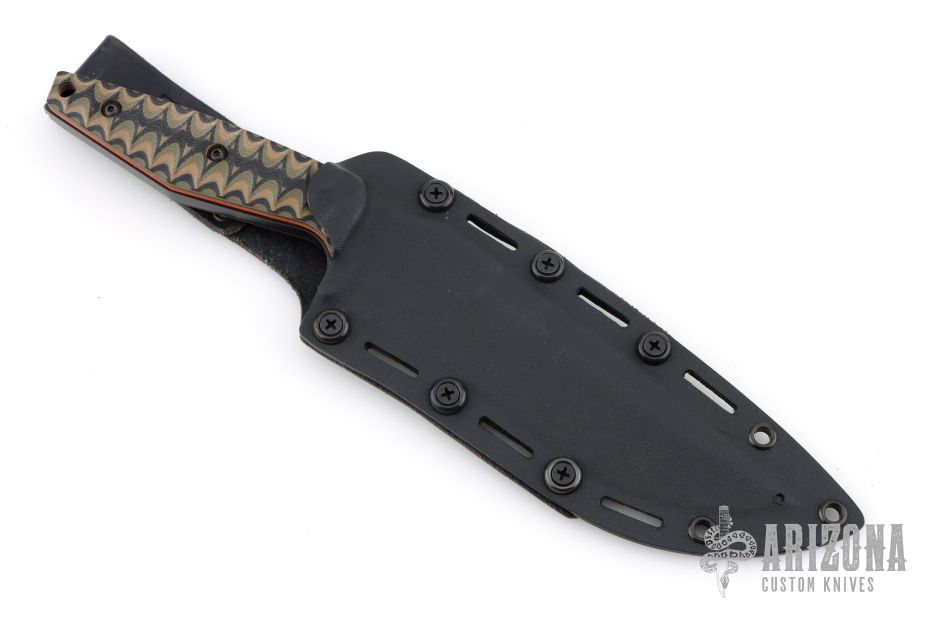 This recurve fighter by Selby Knives features a black blade with .25" blade stock and 1.706" blade depth, full tang construction. The handle has green/tan/black sculpted covers, orange liners, and lanyard hole in pommel. Comes with leather/kydex sheath. Excellent condition.