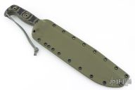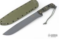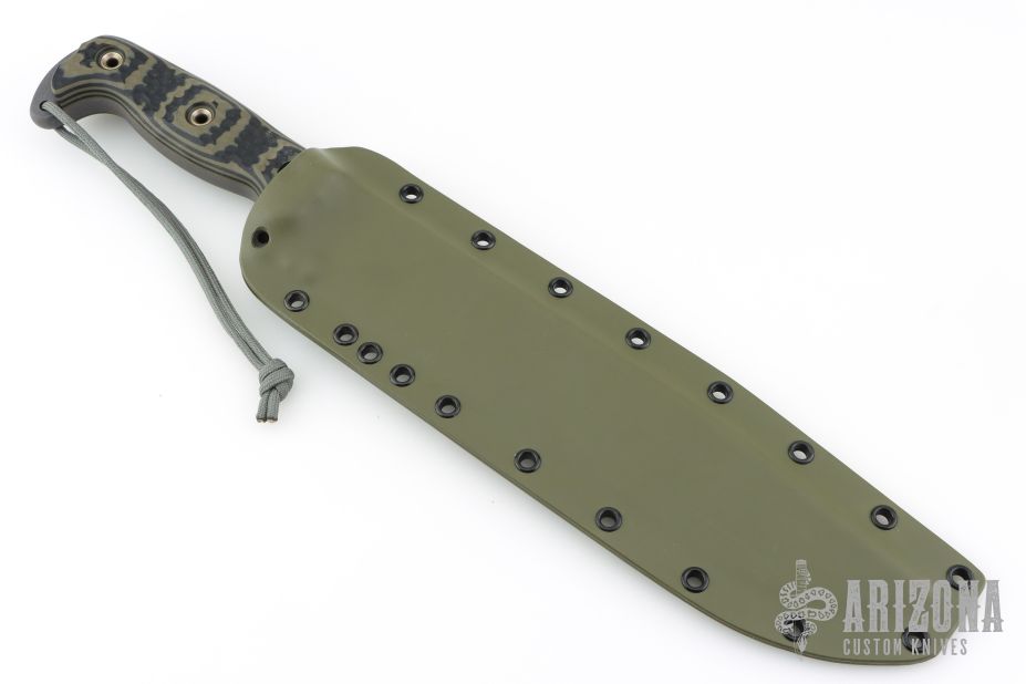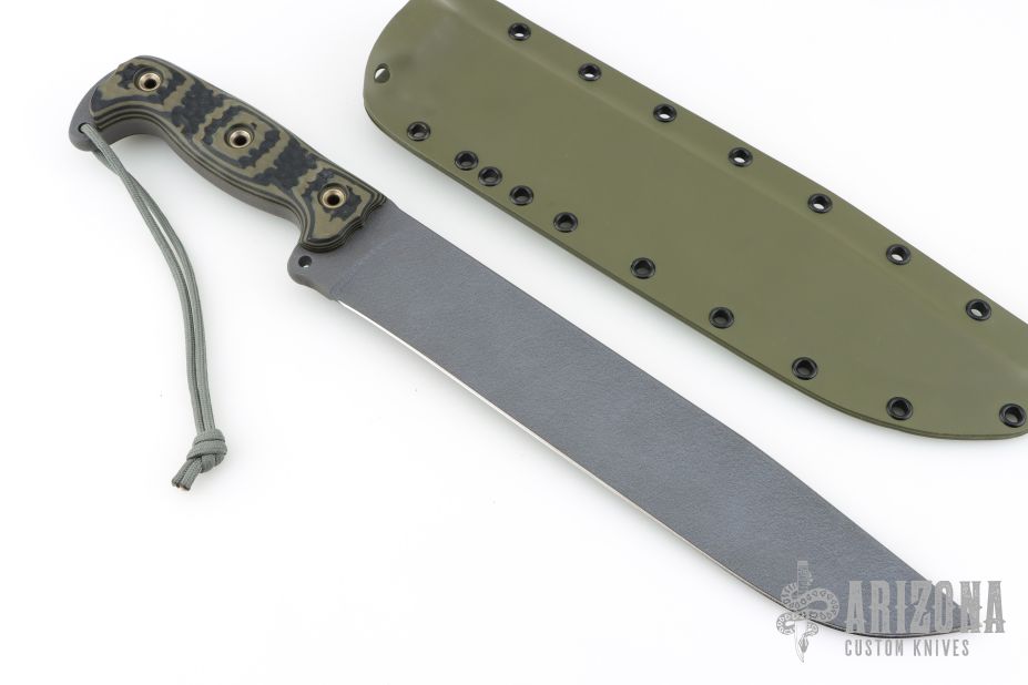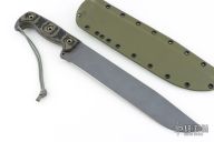 This 20th Anniversary Edition Straight Handle Battle Mistress from the Busse Combat Knife Company features a tanker grey coated blade with NO choil, .324" blade stock, 1.895" blade depth. Full tang construction with black/green G-10 scales. Comes with a custom kydex sheath by BuyBrown. Excellent condition.