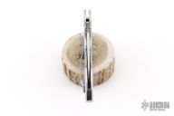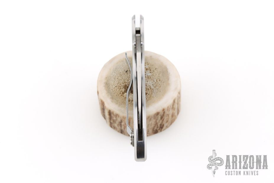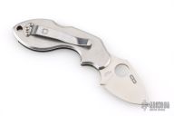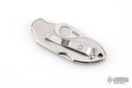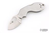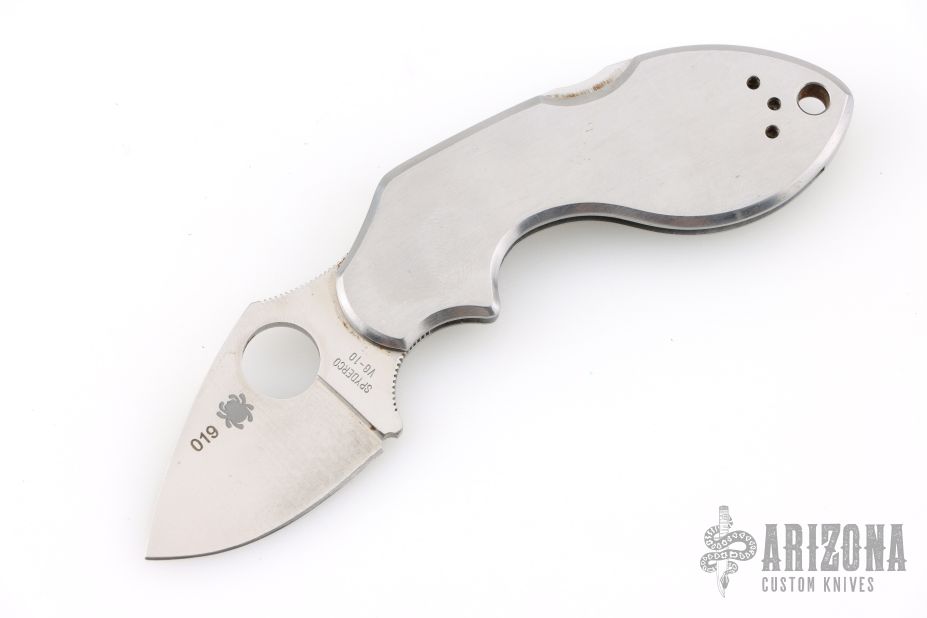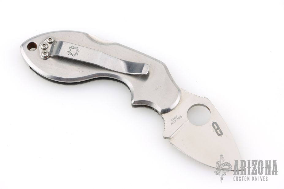 During work hours Chad Los Banos is a Corrections Officer on Hawaii's Big Island. On his free time he is a hobbyist who practices martial arts and collects knives. In both his job and on his free time he handles knives, lots of them in all shapes and sizes. This motivated him to develop his own knife design he calls the Lava. The Lava's form follows function approach piqued Spyderco's interest and a collaborative knife design was the result. The Spyderco/Los Banos Lava has a long curving handle paired with a short blade. The blade's cutting edge drops downward creating a negative blade angle, a positive feature when holding the knife. The negative angle positions the blade's cutting edge lower than the user's index finger so the wrist is in alignment. When the blade and wrist align, you can cut longer with less fatigue and better leverage. Chad's design philosophy was not to force the hand to fit the knife, but have the knife conform to the hand- any sized hand be it large or small. He kept the blade under two inches and Spyderco manufactures it in VG-10 stainless steel, PlainEdged and flat-ground. The stainless steel handle curves ergonomically with a cutaway finger choil, pronounced enough to seriously wrap a hand around and solidly grip. A backlock with a Boye safety dent, locks the blade open and a steel pocket clip positions the (closed) knife, tip facing upward, in the pocket. Has scratches, otherwise good condition.