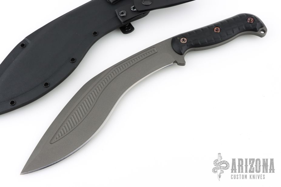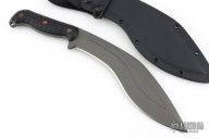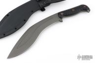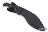 Classic kukri design done RMJ style! The big kukri blade is an excellent large utility blade with a versatile profile. The main body of the blade is great for chopping and cutting through thick obstacles (think machete), with a narrower tip for poking and finer work. The thinner portion near the handle is great for shaving/carving tasks. The handle swells to feel great in hand, and the the guard helps keep your hand from slipping forward during impacts. The beveled and contoured grips are held together by bronze anodized hardware and feature Monkey Edge FRAG Pattern for a not too aggressive but secure grip. The knife has a Cerakote finish for corrosion resistance. Comes with molded kydex scabbard with Low Ride M.O.C. loops.