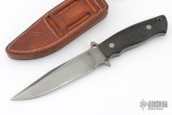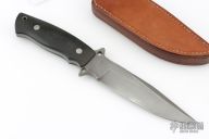 This custom M32 Fieldmaster #106G (6th knife made in 1986) has a double guard which is special as the Fieldmaster is standard with a single guard.  The M32 is a rare knife to begin with as it wasn't the most common typical M30 etc. It features a bead blasted blade with a sharpened top edge and notched thumbrest, .262" blade stock and 1.319" blade depth, full tang construction. The handle has black linen micarta scales.
