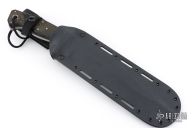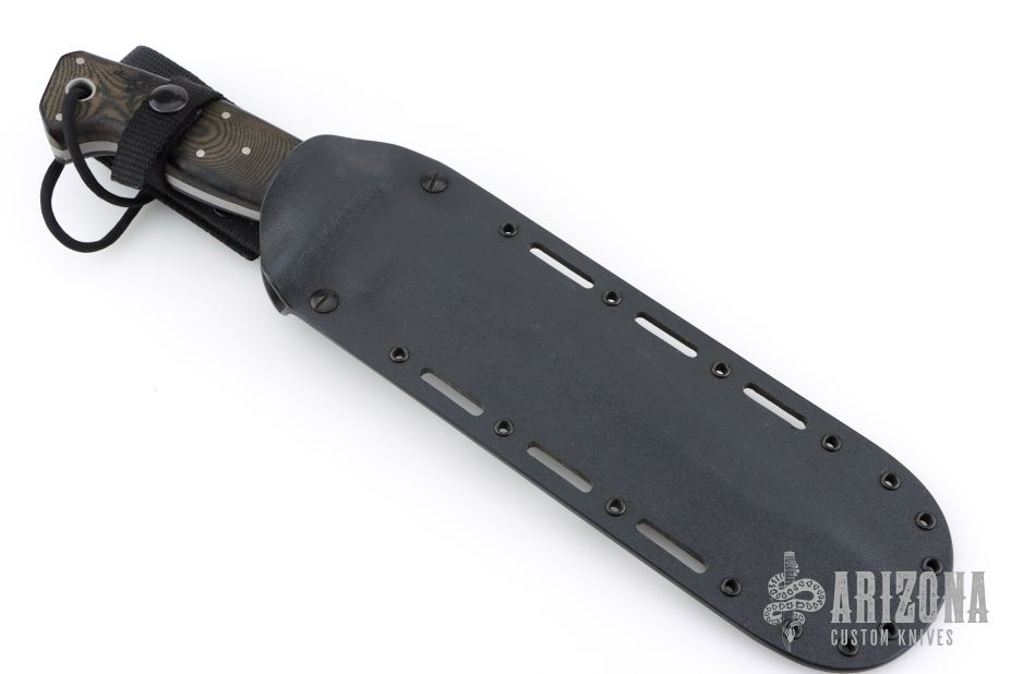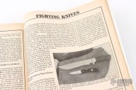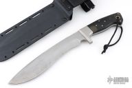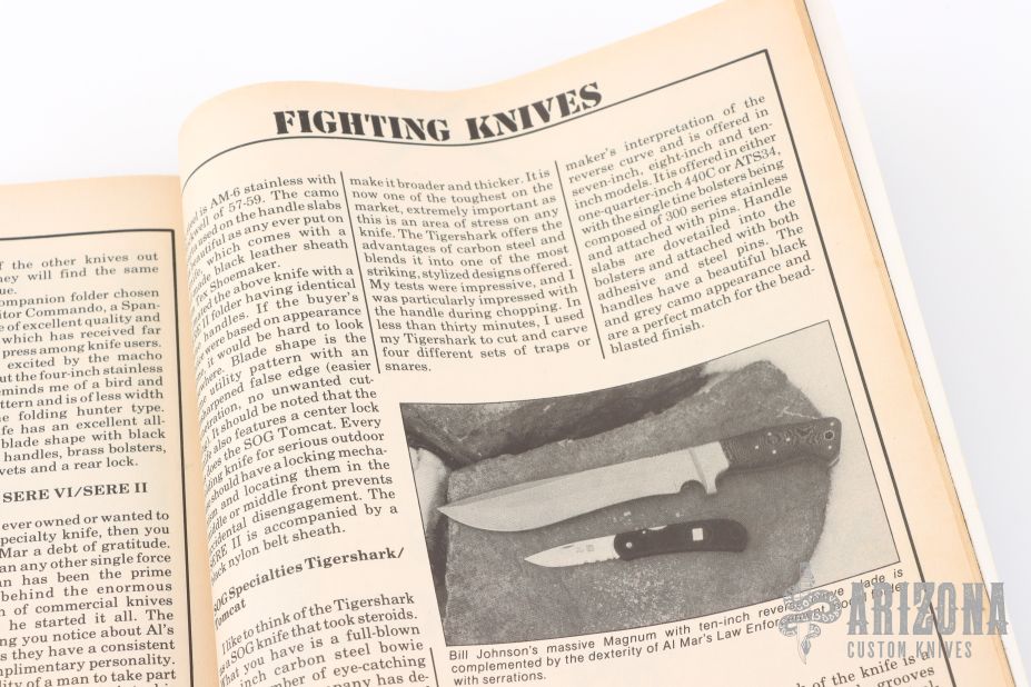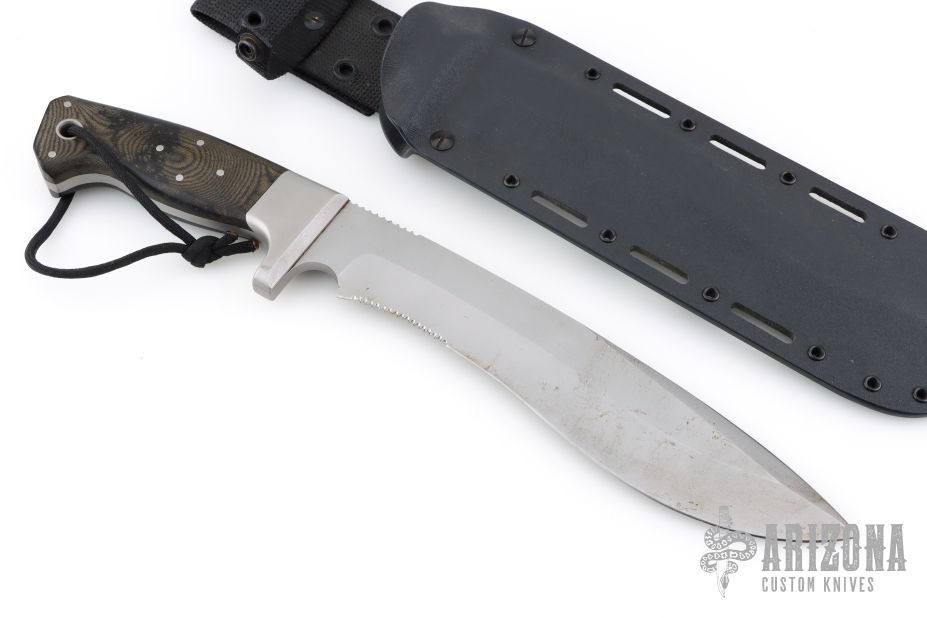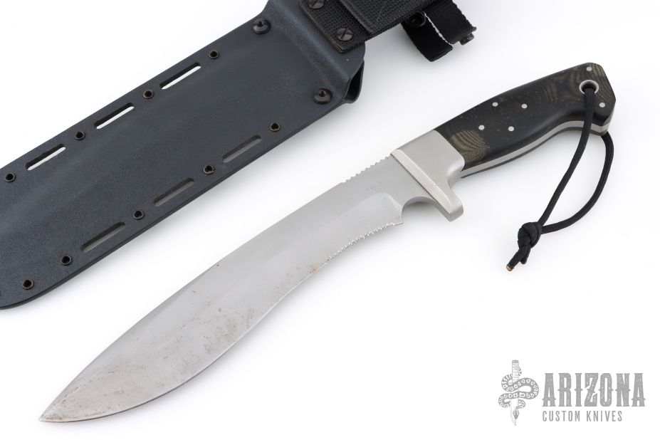 This knife by WC Johnson features a bead blasted recurve blade with notched thumbrest and false top edge, partial serrations, .246" blade thickness and 1.191" blade depth, full tang construction. The handle has bead blasted and dovetailed 303 Stainless Steel bolsters, black linen micarta scales. Great feel in the hand. Very nice work. Comes with a black Kydex sheath with nylon belt sheath. Included Fighting Knives Volume 1, Number 7 where this knife is featured. The knife has some scratches and patina. Great overall condition.