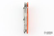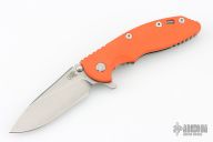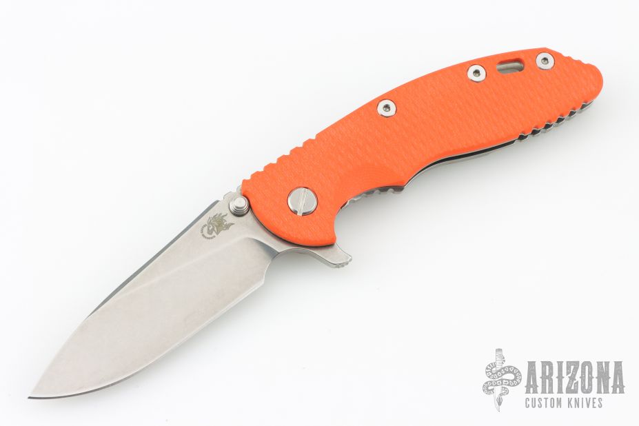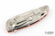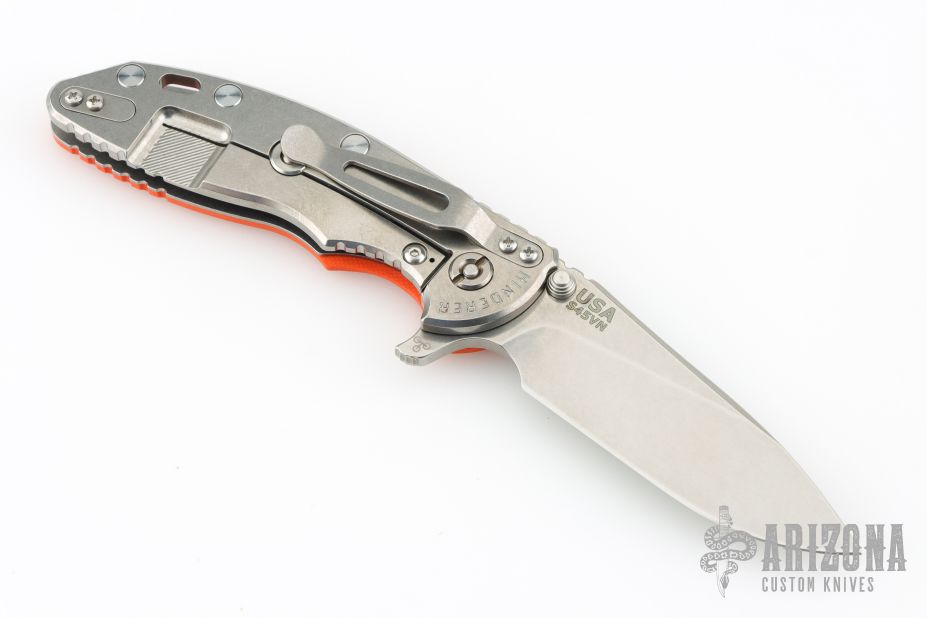 This XM-18 by Rick Hinderer features a stonewash finished blade with notched thumbrest and flipper. The handle has a stonewashed titanium frame with orange G-10 scale, and a tip up or down reversible titanium clip, pivot, and filler tab, lanyard hole at the butt. Comes with original box and extra hardware. Excellent condition.