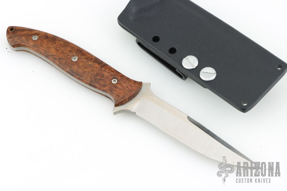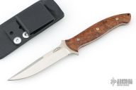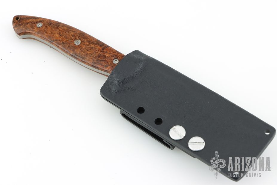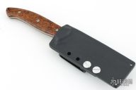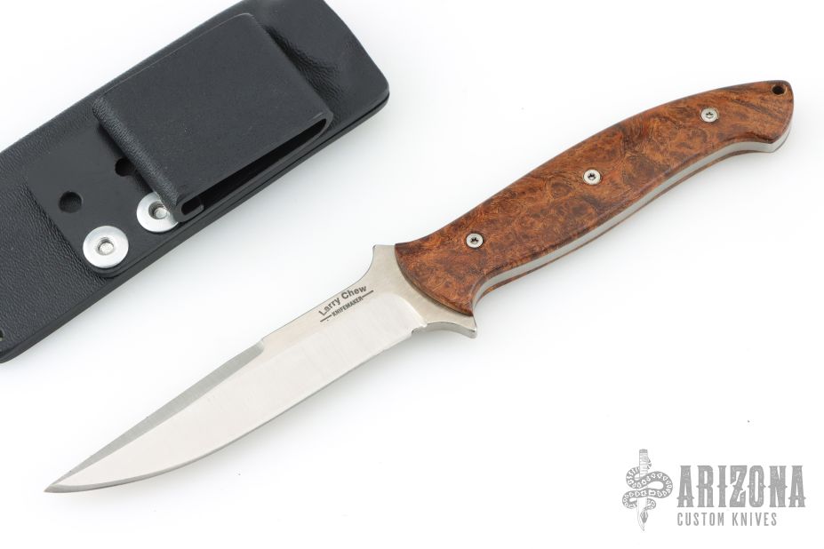 This small fighter by Larry Chew features a satin finished blade with false top edge, .148" blade stock and .696" blade depth, full tang construction. The handle has wood scales. Comes with a kydex sheath. Has a few light scratches, otherwise Excellent condition.