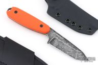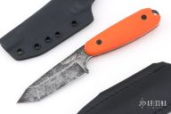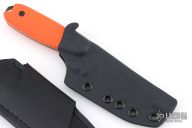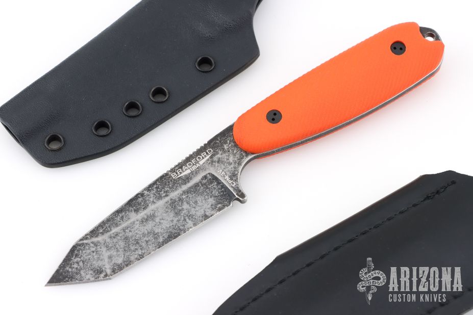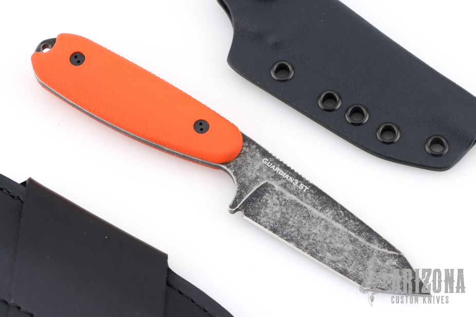 This Guardian 3.5 by Bradford Knives features a dark stonewashed tanto blade with notched thumbrest, .152" blade stock and 1.191" blade depth, full tang construction. The handle has a milled orange G-10 scales. Exposed tang pommel with lanyard hole. Includes original box, papers and Kydex sheath. Comes with an addition black leather sheath. Excellent Condition.