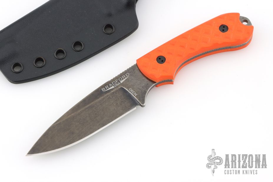 The Guardian3.2 is a relatively compact fixed blade that is designed to handle the work load that might typically fall upon a heavy duty everyday folder. Bradford Knives uses Bohler M390 steel with a double temper and cryo treatment for exceptional blade characteristics. Machined G-10 scales offer extreme grip without being abrasive. Each knife includes a premium leather sheath with belt loop and plastic blade insert.