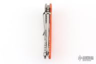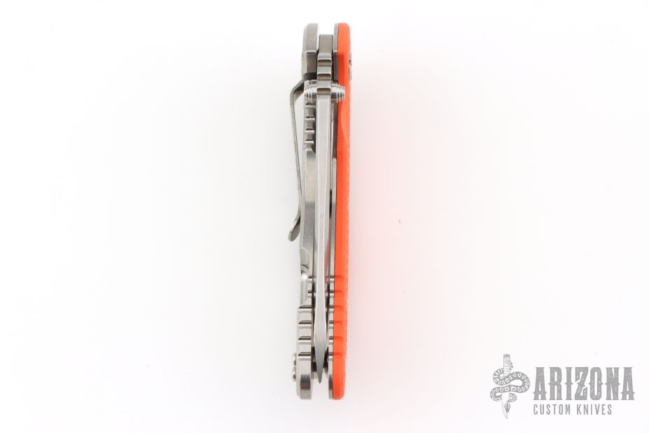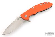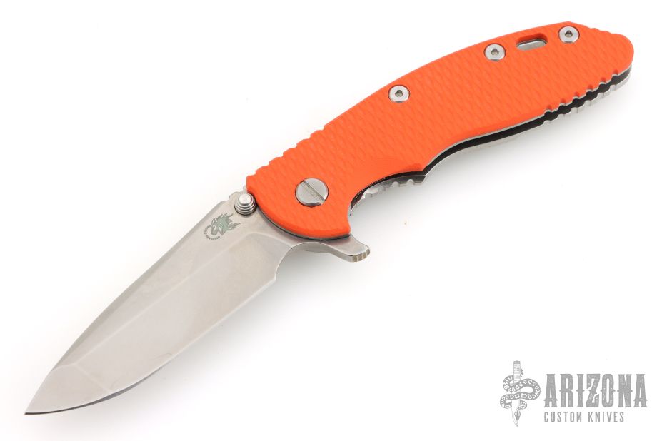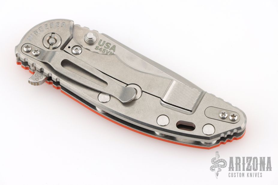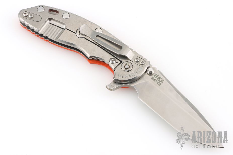 This XM-18 Flipper by Rick Hinderer Knives features a 3.5" stonewash finished blade, notched thumbrest and flipper, dual thumbstuds. The handle has an orange G-10 scale, and a stonewash finish titanium handle and satin finished hardware, and matching titanium clip. Clip can be mounted for tip up or down carry. Nice lockup, seating, and detent. Comes with original box and extra pivot hardware. Excellent condition.