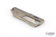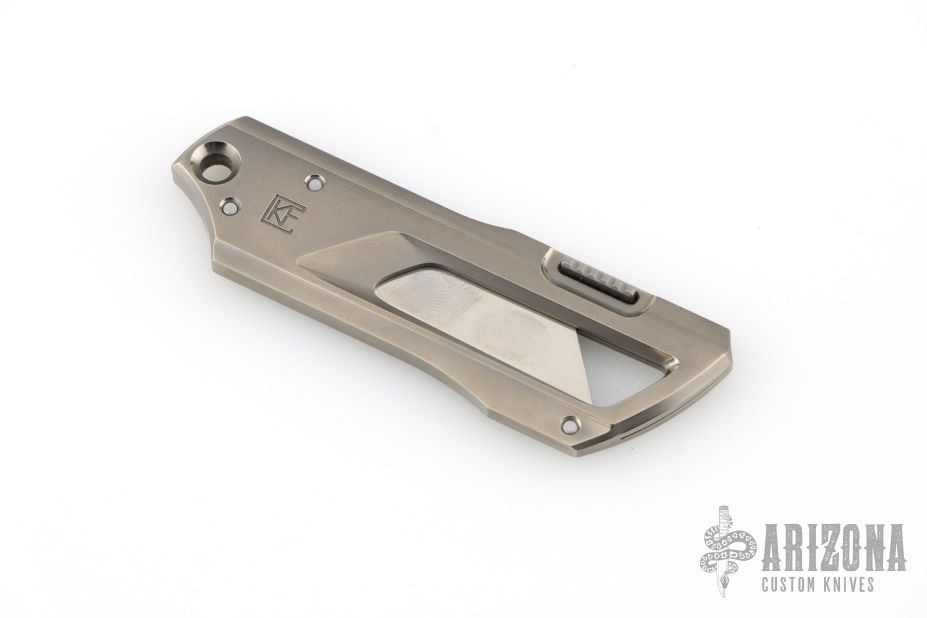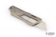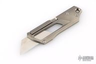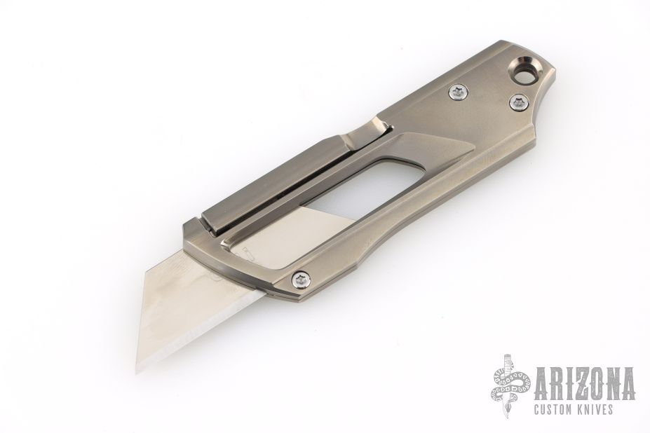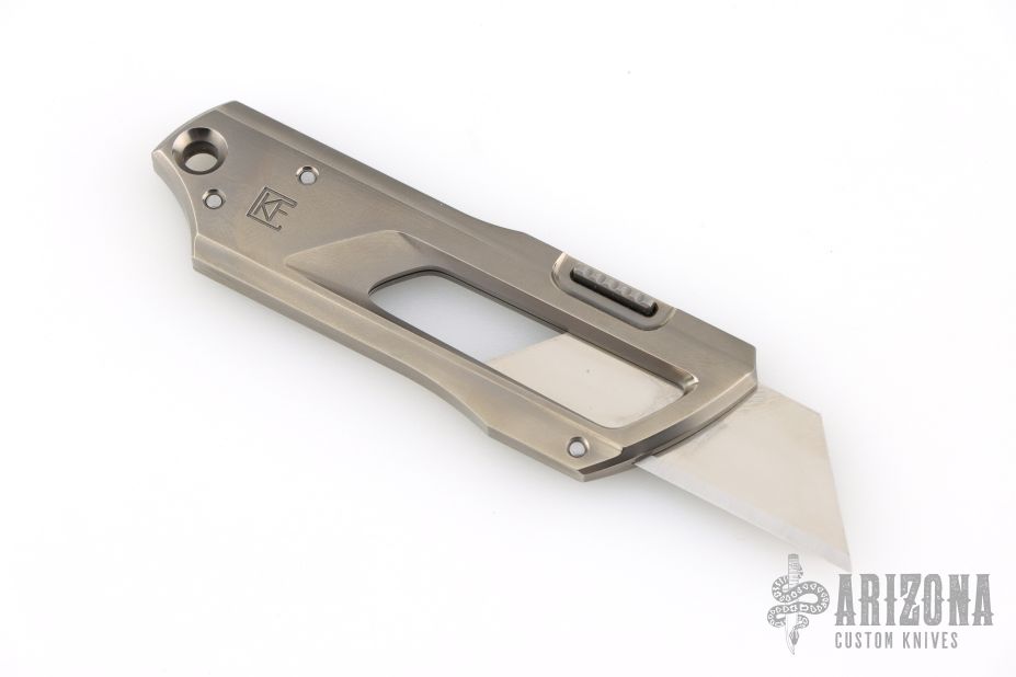 Custom Knife Factory Anton Malyshev Kanza Utility Knife, Replaceable Standard Utility Blade, Machined Titanium Handle. It's tough enough to withstand cutting drywall, gypsum boards, roofing materials, plastic, wood, cardboard, paper, and linoleum while remaining as flat as physically possible. Two-hand opening design. Comes with original Velcro case and a set of black screws. Excellent Condition.