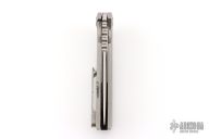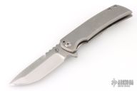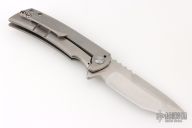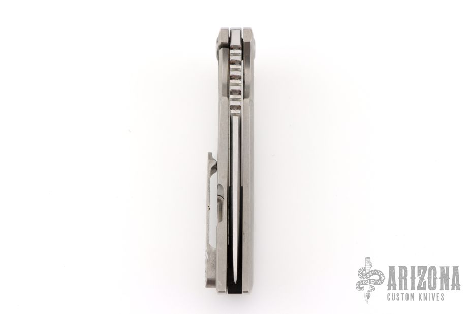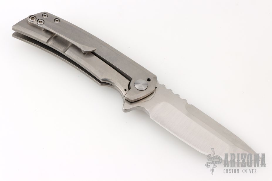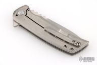 This knife from Desert Blade Works features a satin finished tanto blade with notched thumbrest, and flipper tab. The handle has a stonewash finished titanium frame with matching titanium tip up clip. Nice action, detent, and blade centering. Comes in a zipper case with maker's card. Has a few light scuffs and scratches, excellent condition otherwise.