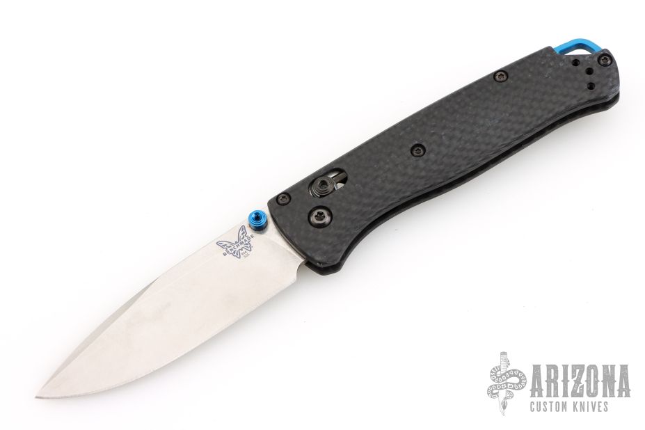 The 535-3 Bugout knife is built with a carbon fiber handle and a satin finished blade with a plain cutting edge.