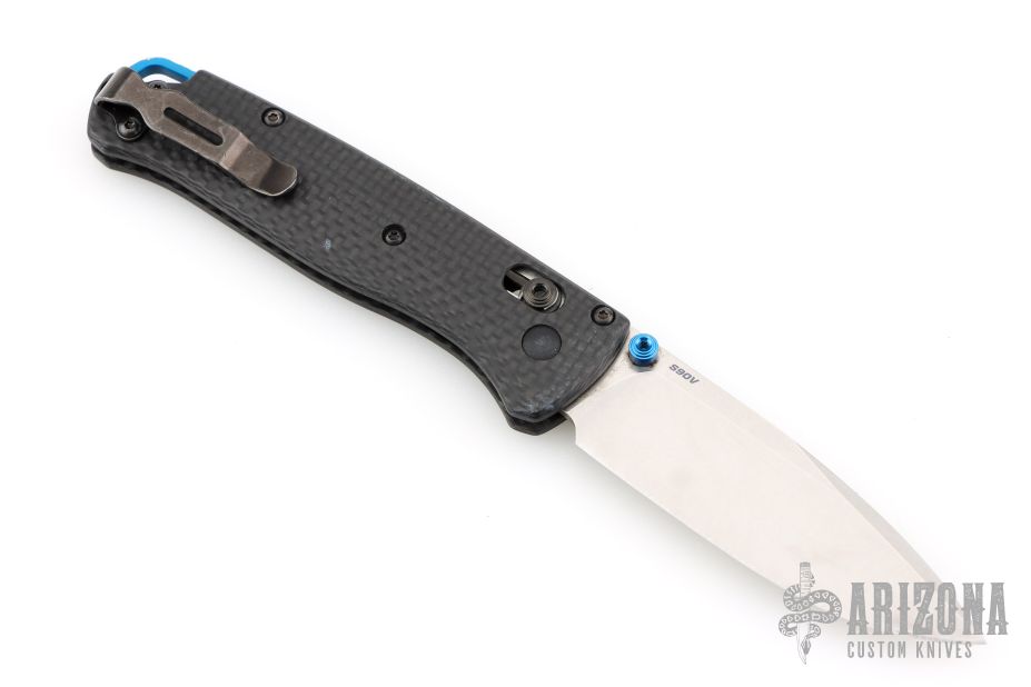 The Benchmade Bugout offers a lightweight, ergonomic build designed with everyday carry and general outdoor use in mind. Its super premium CPM-S90V blade sports a partial swedge to provide a finer point, and comes fitted with blue anodized, dual thumb studs for easy one-handed operation. The comfortable handle has been shaped for added grip without being abrasive. Comes complete with an oversized lanyard hole and reversible deep-carry clip for convenient EDC.