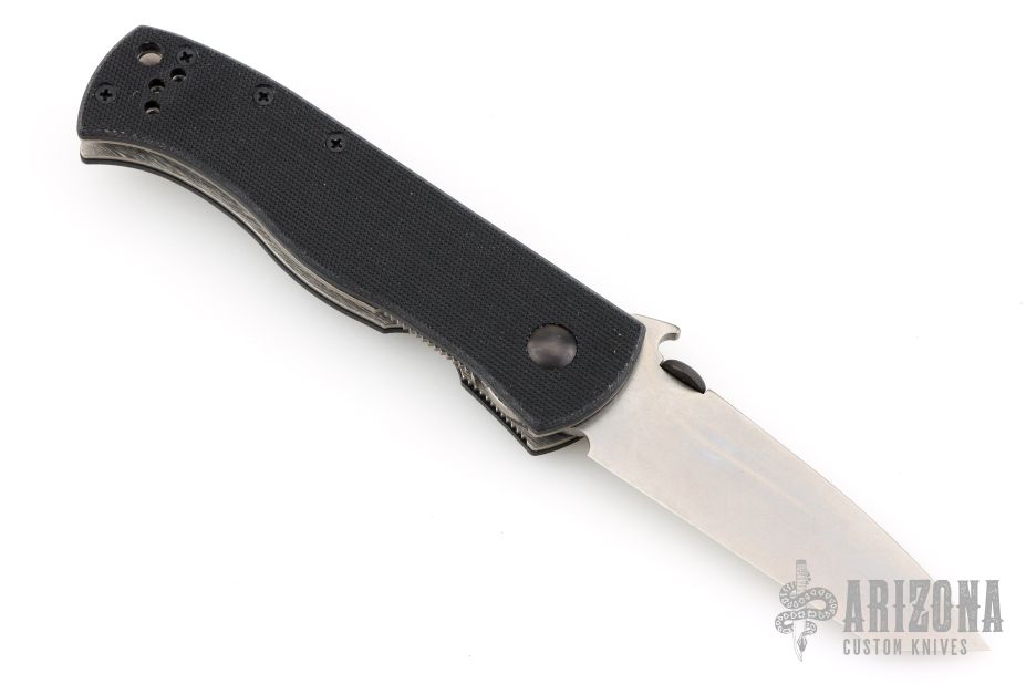 This production CQC-7 from Emerson Knives has a chisel ground stonewash finished tanto blade and textured black G10 handle. Wave feature and thumb disk. Perfect lockup, detent, and seating. Has a black tip up clip.  Includes original box and paperwork. #6739 on blade. Comes with original box and papers. Excellent condition.
