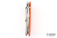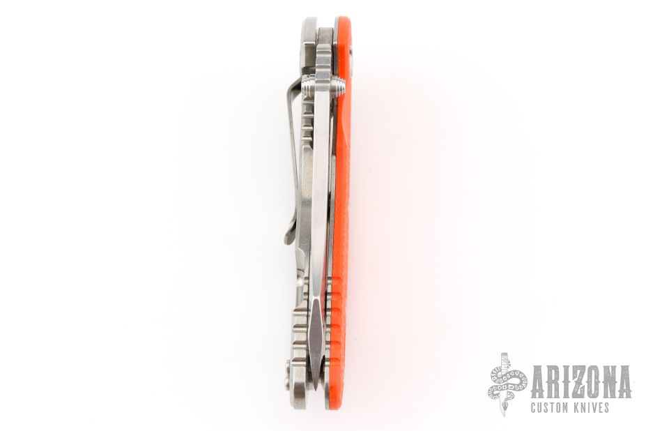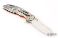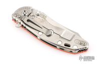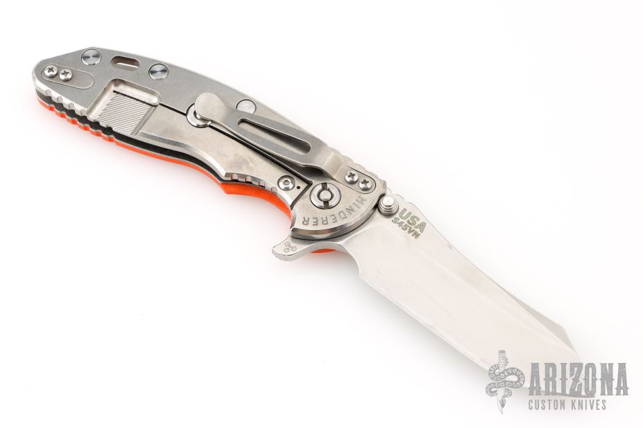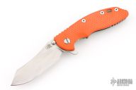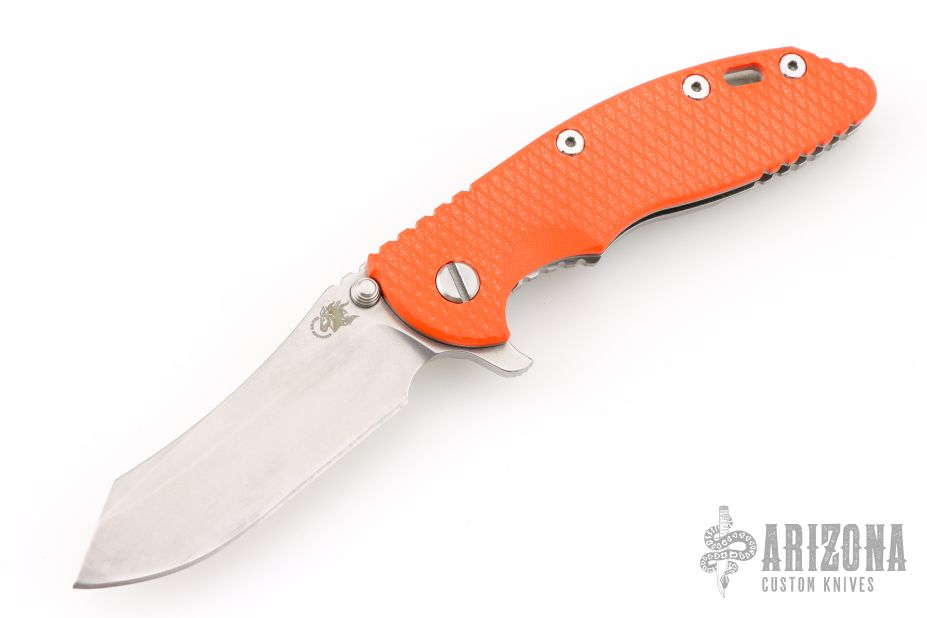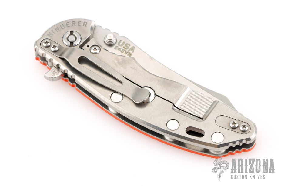 This XM-18 skinner by Rick Hinderer Knives features a 3.5" stonewash finished blade, notched thumbrest and dual thumbstuds. The handle has a orange G-10 scale, and a stonewashed titanium handle/clip. Clip can be mounted for tip up or down carry. Tri-way pivot system.  Nice lockup, and detent. Includes the original box and extra washers. Excellent condition.