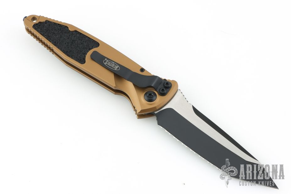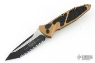 This Socom Elite Auto has a two-tone tanto fully serrated blade with notched thumbrest. Tan aluminum handle with non-slip inserts. Stainless steel clip, tip down carry. Glass breaker. Dated 05/2025 and s/n 16941. Comes with original box and papers. New condition.