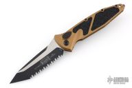 This Socom Elite Auto has a two-tone tanto fully serrated blade with notched thumbrest. Tan aluminum handle with non-slip inserts. Stainless steel clip, tip down carry. Glass breaker. Dated 05/2025 and s/n 16930. Comes with original box and papers. New condition.