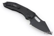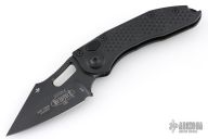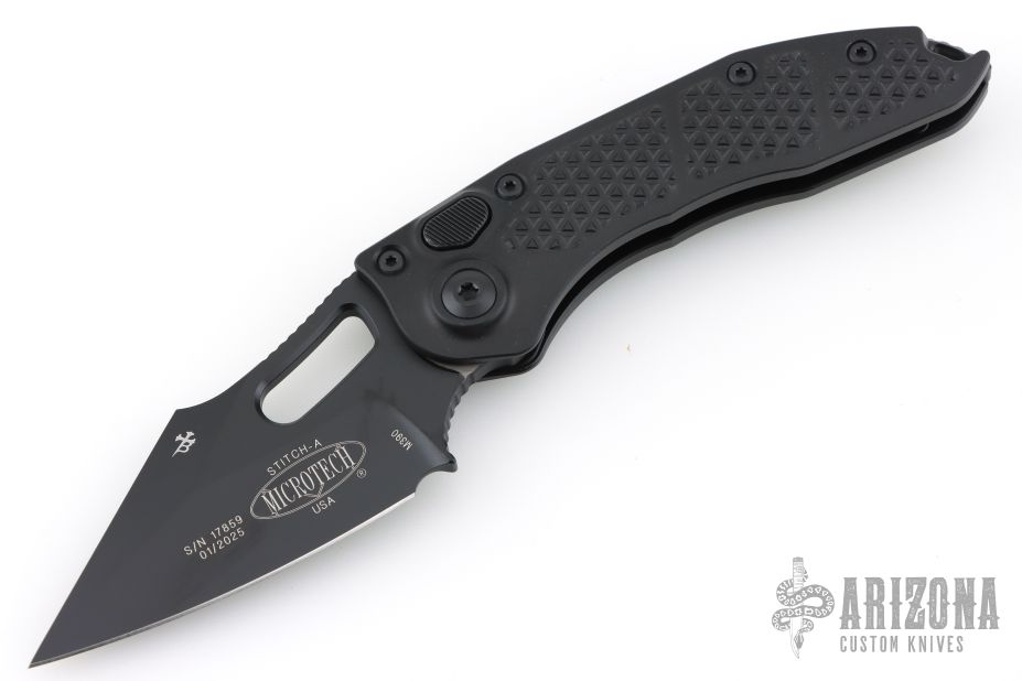 This Stitch Auto by Microtech Knives features a DLC finished blade and false top edge, notched thumb and finger rests. The handle has a black anodized and milled aluminum handle with a DLC titanium backspacer, DLC stainless steel hardware and clip, tip up carry, lanyard hole at the butt. Comes with original box and papers. S/N 17859 and dated 01/2025. New condition.