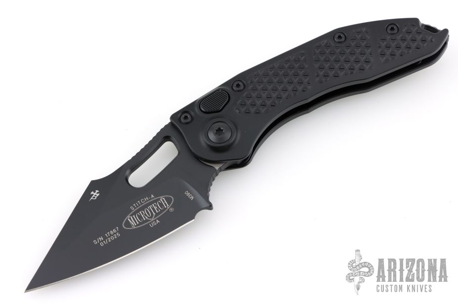 This Stitch Auto by Microtech Knives features a DLC finished blade and false top edge, notched thumb and finger rests. The handle has a black anodized and milled aluminum handle with a DLC titanium backspacer, DLC stainless steel hardware and clip, tip up carry, lanyard hole at the butt. Comes with original box and papers. S/N 17867 and dated 01/2025. New condition.
