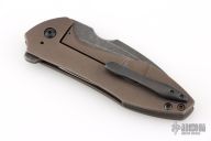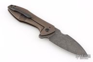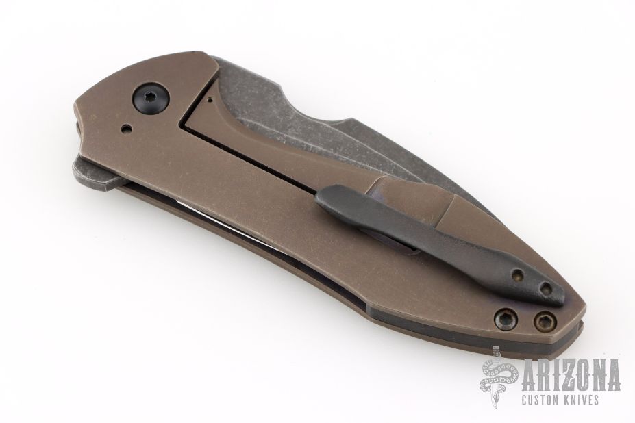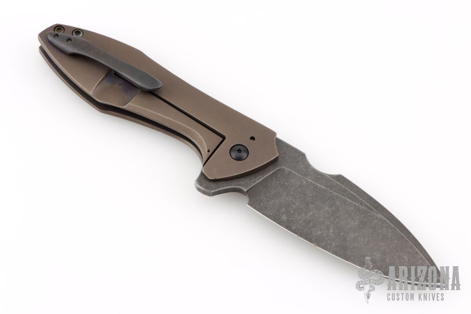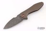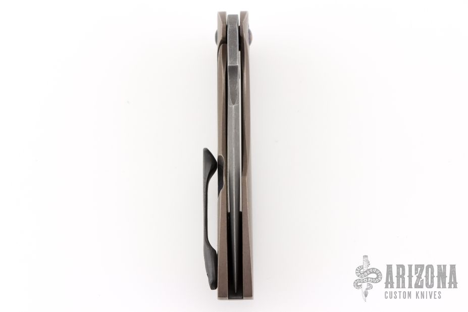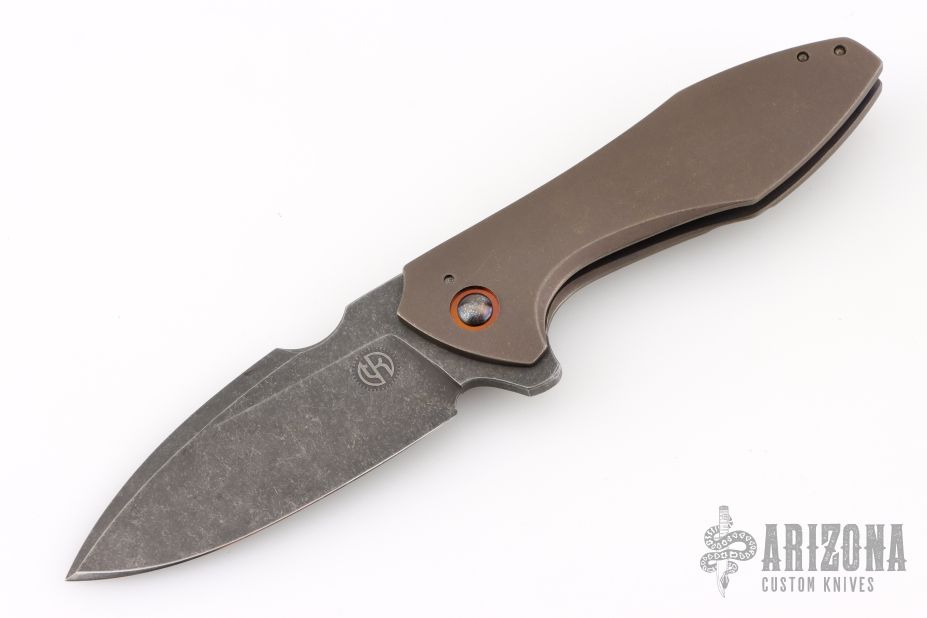 This Tracer by Tuff Knives features an acid tumble finished blade with flipper. The handle is comprised of an anodized tumble finished titanium frame, orange peel zirconium backspacer and tip up sculpted zirconium clip. Nice lockup, detent and blade seating. Has some light scuffs, otherwise good condition.