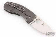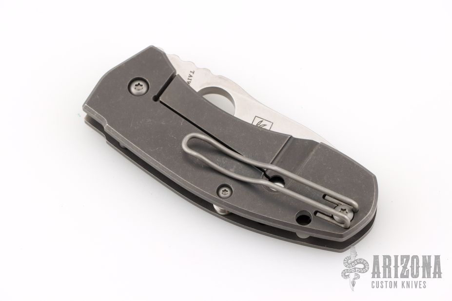 This Techno from Spyderco features a tumble finish blade with thumb hole. Tumble finish titanium frame with polished spacers. This model is now discontinued. Comes with the original box, and notched blue backstrap. Excellent Condition.