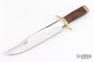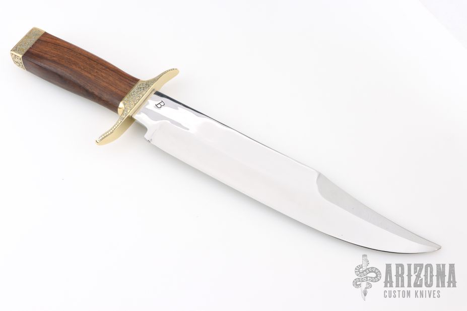 This Hell's Belle Bowie by Bill Bagwell is Number 5 and was made in 1969-70. It was engraved by EC Prudhomme in 1972. It has a mirror polished blade with sharpened top edge, .255" blade stock and 1.778" blade depth, hidden tang construction. The handle has engraved brass guard and butt, cocobolo grip with an engraved brass escutcheon on the spine of the handle that reads "Hells Belle No.5". Excellent condition. Coems with a zippered case. This knife has his rare and early slanted "B" makers mark.