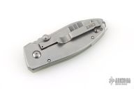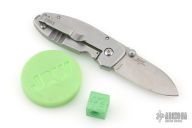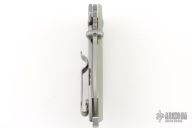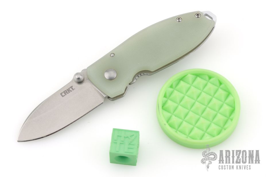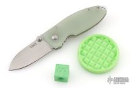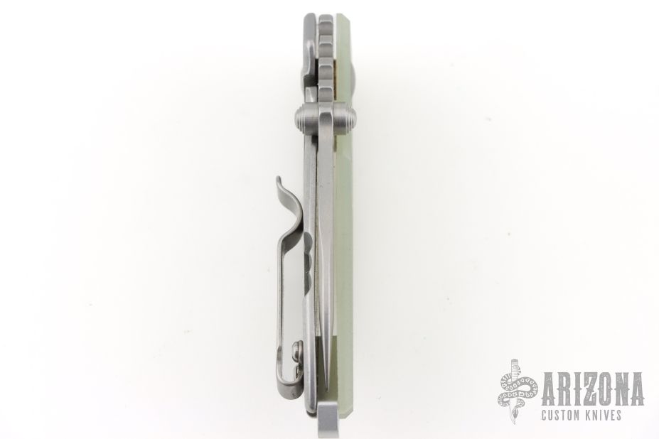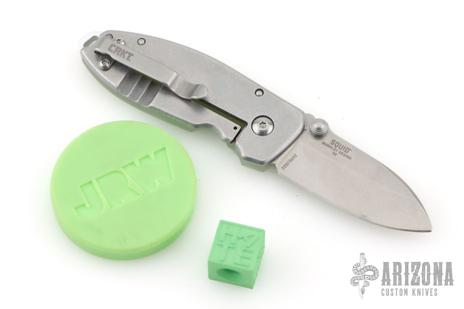 This Squid is a Lucas Burnley Design executed by Columbia River Knife and Tool. It features a tumble finished drop point blade with swedge, dual thumb studs and notched thumb rest. The handle is comprised of a Jade G10 "A" side scale and tumbled lock side over a matte silver backspacer with lanyard bail. The deep carry steel pocket clip is positioned for right hand, tip up carry.