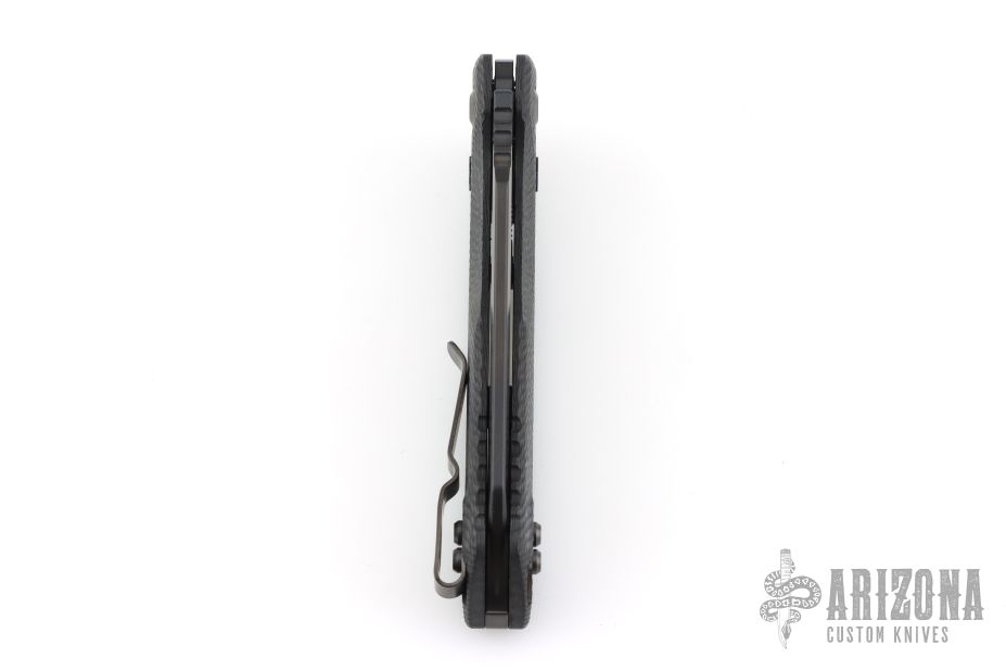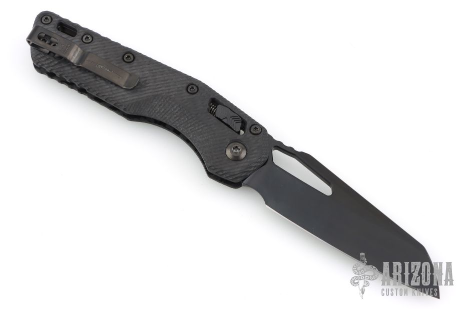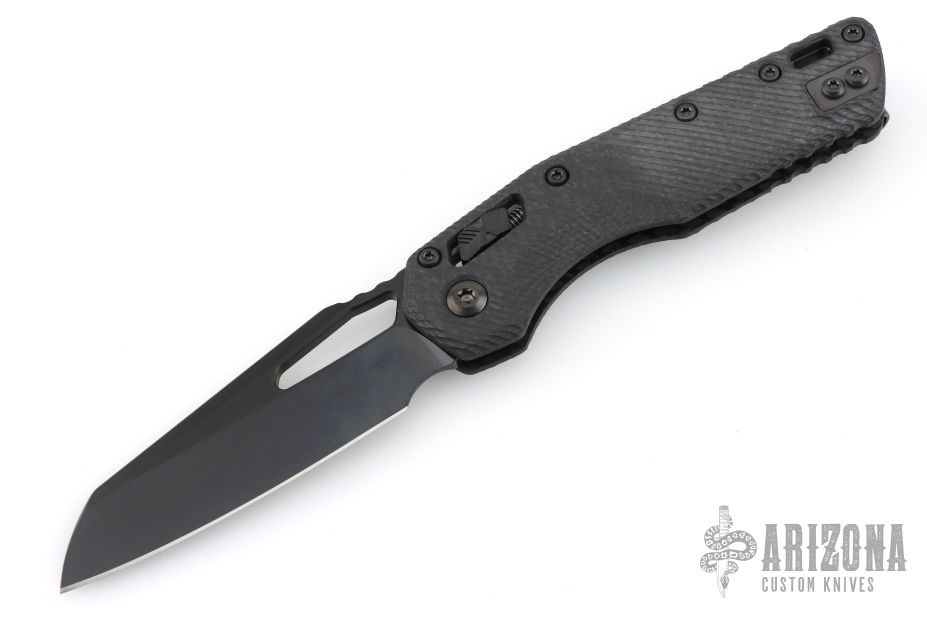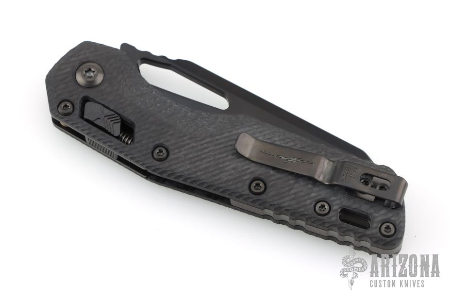 This MSI by Microtech features a black DLC stonewashed blade, thumbhole and notched thumbrest. The handle has carbon fiber scales, black DLC  hardware, backspacer and tip up reversible clip. Comes with original box and papers. Excellent condition. Dated 06/2024