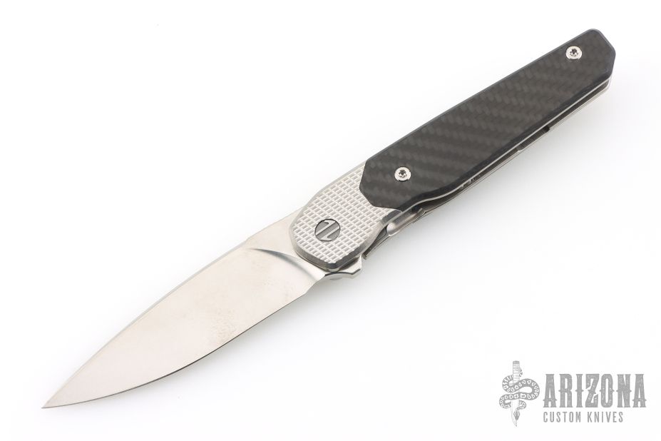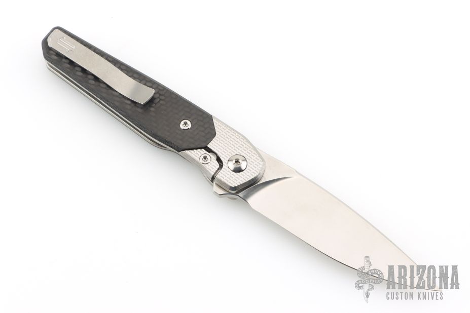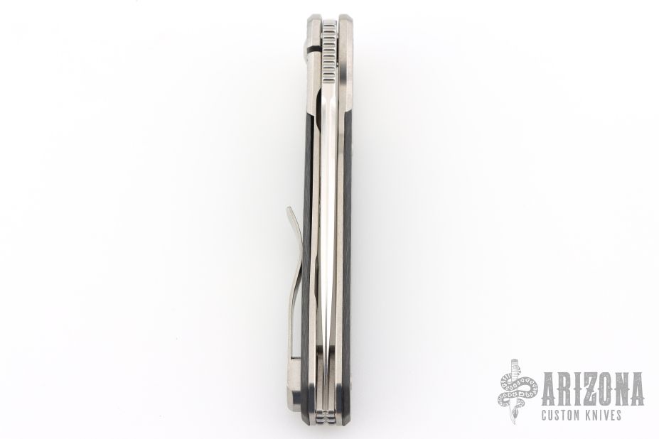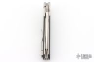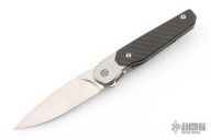 This LHC-X by Brown Knives features a drop point stonewashed blade with notched thumbrest and flipper. The handle has milled titanium bolsters, carbon fiber covers, titanium liners, backspacer and tip up clip with hidden screws. Rides on bearings, nice detent, lockup and blade seating. Comes with original box and COA #252. Excellent condition.