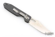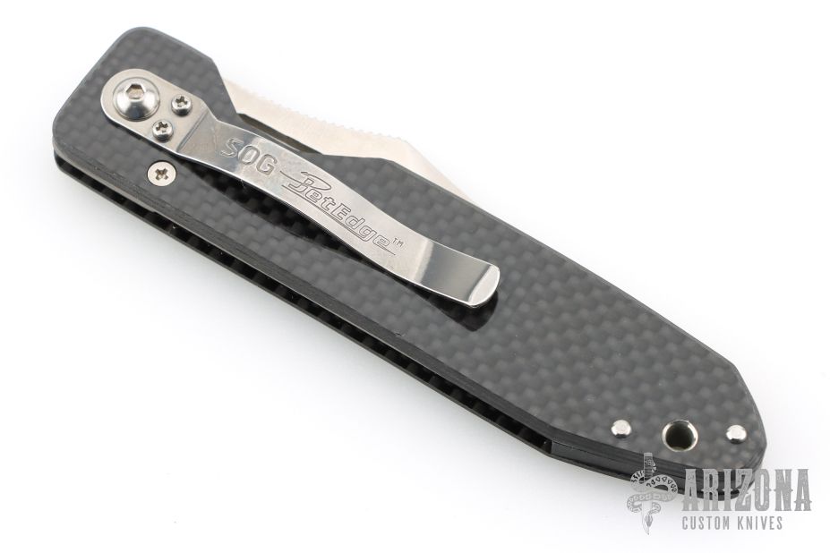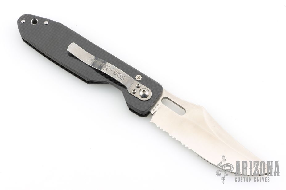 This Jet Edge 2 by SOG Knives features a partially serrated clip point blade with swedge, thumb hole and notched thumb ramp. The handle is comprised of a carbon fiber frame over a single steel liner and black polymer backspacer. Stainless steel tip down clip is positioned for right hand carry. Lanyard hole in pommel. This model has been discontinued.