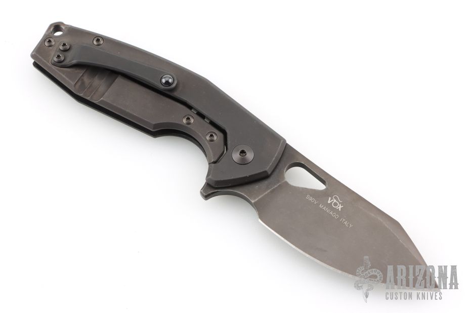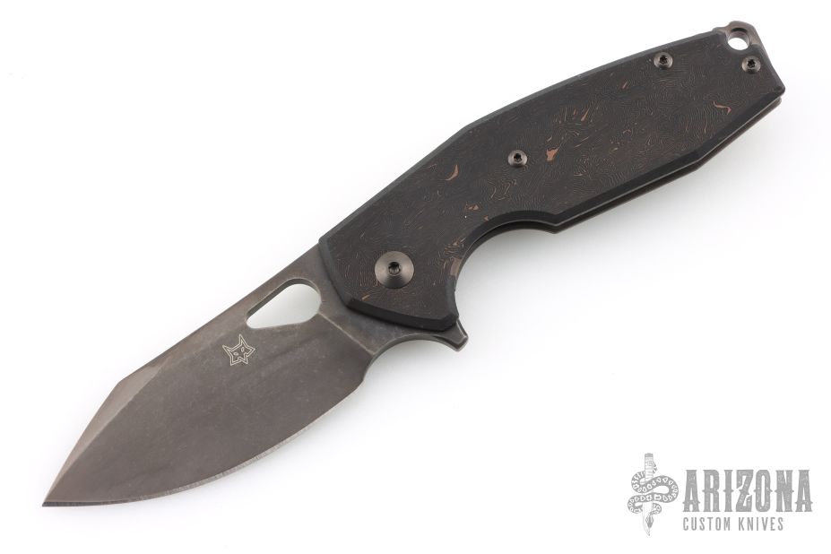 This Yaru by Fox knives features a dark tumbled blade with thumbhole. The handle has a distressed titanium frame with a carbon fiber scale. Includes the original box, padded case papers. Excellent condition.
