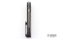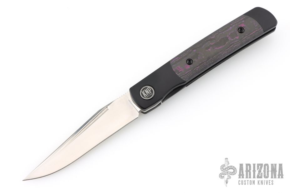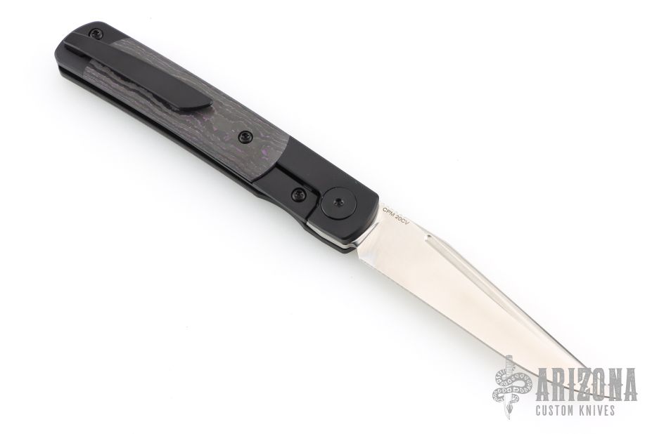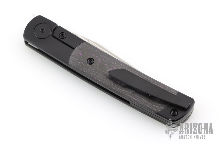 This Rook by Adam Purvis features a stonewashed/polished blade with fullers and notched front flipper. Has a black PVD titanium frame with purple carbon fiber scales, black titanium backspacer and tip up clip with hidden screws. Comes with original box. Excellent condition.