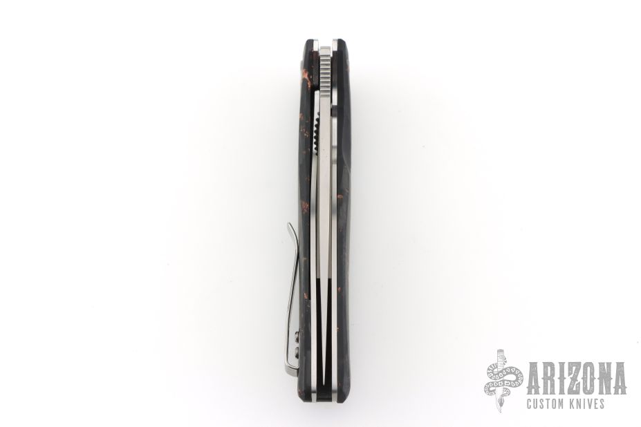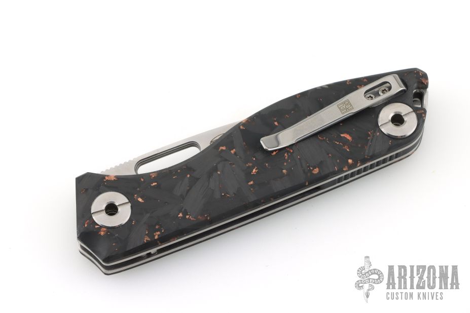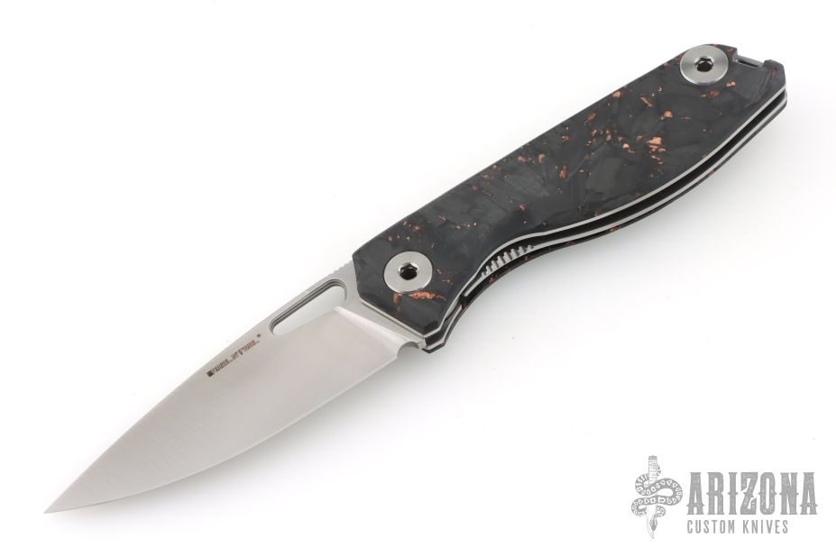 The Real Steel Sidus folding knife is a fashionable EDC knife made of D2 steel and a copper shred carbon fiber handle. It's got comfortable ergonomics, a drop point blade, flow through construction, and a unique hollow pivot screws and standoffs. Add this awesome EDC piece to your collection today!