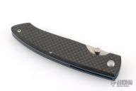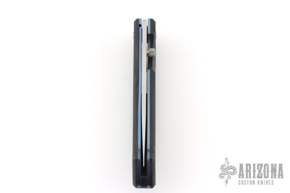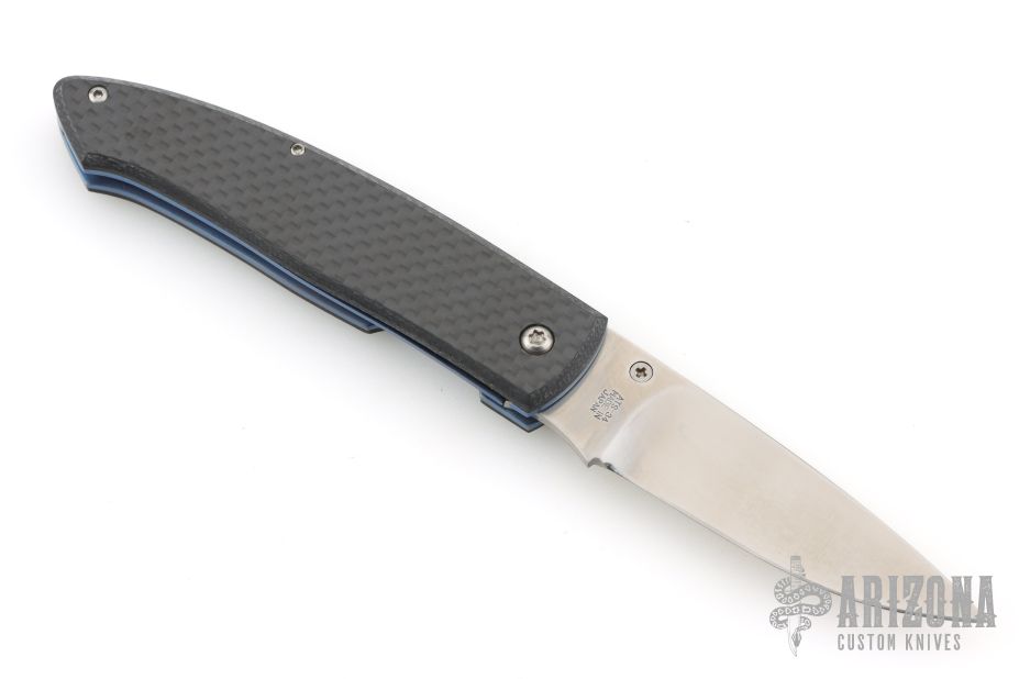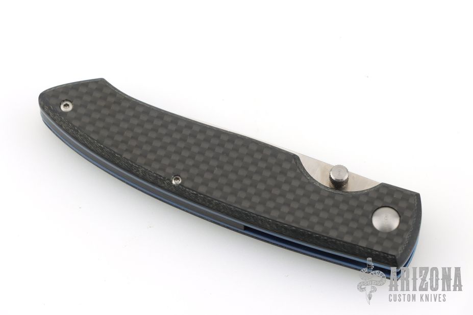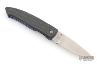 This linerlock from A.G. Russell has a polished satin finished blade with thumbstud. The handle has carbon fiber covers, blue anodized liners, and black polymer backstrap. Comes with original box. Excellent condition.