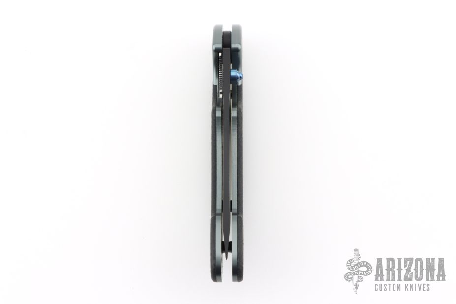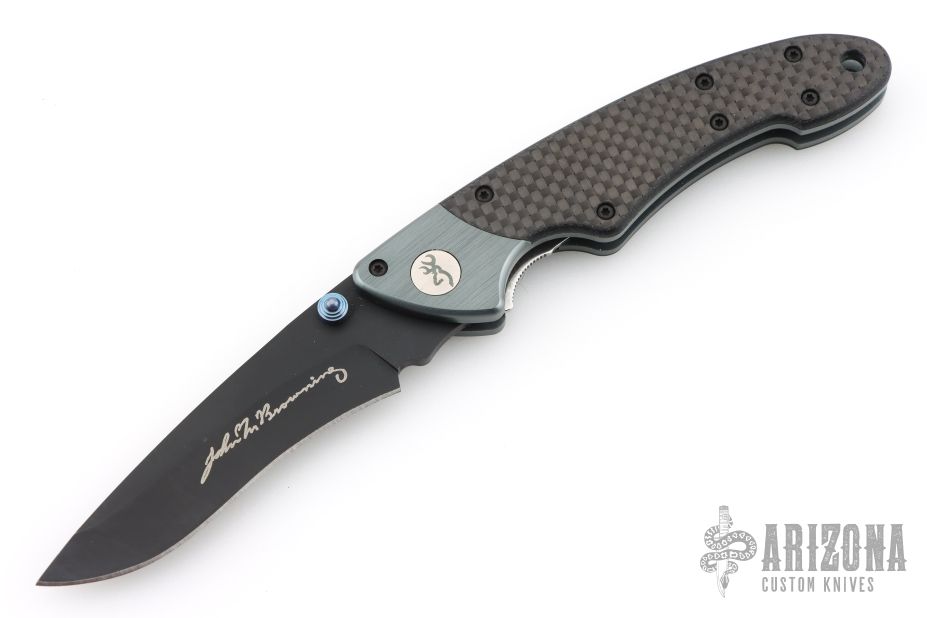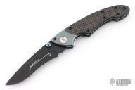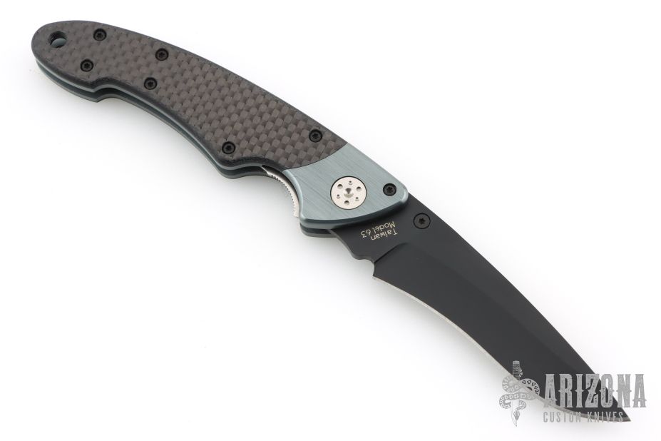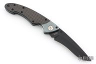 This Model 63 Linerlock Folder has a black recurve blade with single thumb stud. The handle has carbon fiber covers, Titanium liners, bolsters, and standoffs. Steel inlaid liner and lanyard hole in pommel. Comes with original box and nylon belt sheath. Excellent condition.