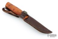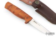 Fossekallen has the same well proportioned shape as its bigger brother – sanded by hand to a satin finish and well-shaped to offer comfort during long carving sessions. It offers a secure grip with a significant finger stop. A perfect all-round knife for small to medium size hands.
