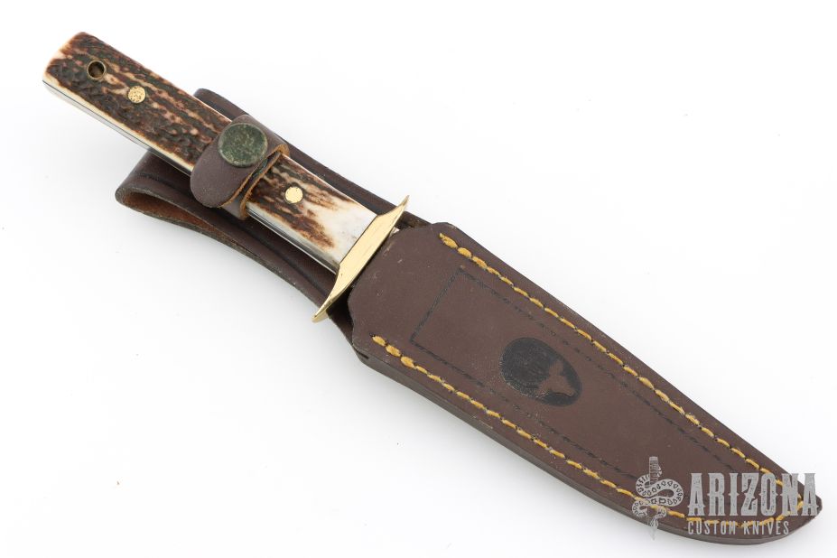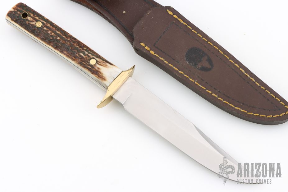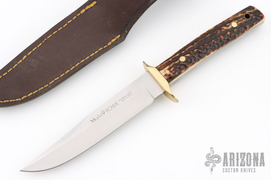 This Bowie by Muela features a satin finished blade with false top edge, .138" blade stock and .956" blade depth, full tang construction. The handle has a brass guard and stag scales with brass pins and lanyard hole. Comes with leather sheath. Excellent condition.