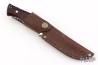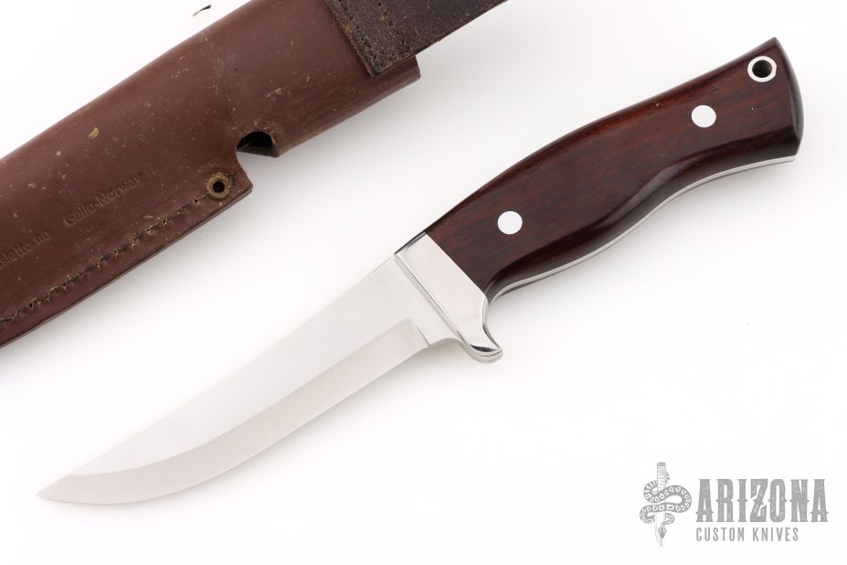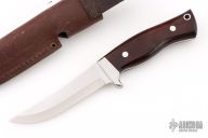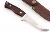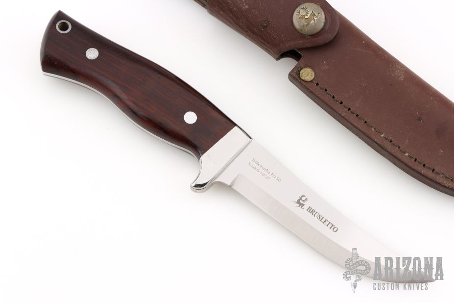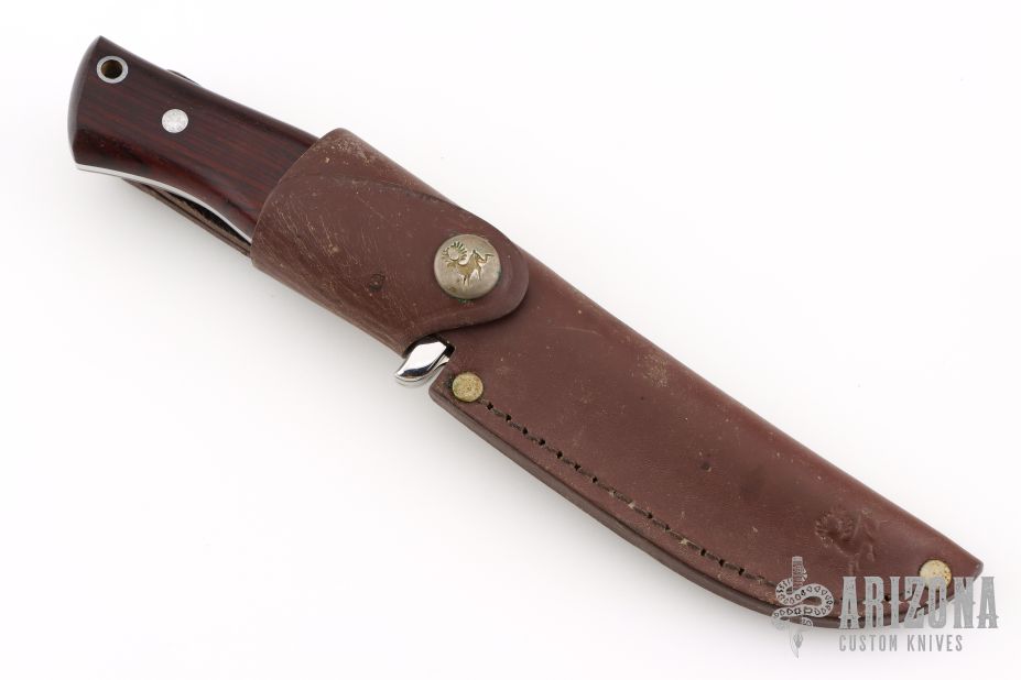 This knife by Brusletto features a polished scandi ground blade, .113" blade stock and .969" blade depth, full tang construction. The handle has polished stainless steel bolsters, cocobolo scales with aluminum pins and lanyard hole. Comes with brown leather sheath. Excellent condition.