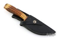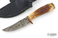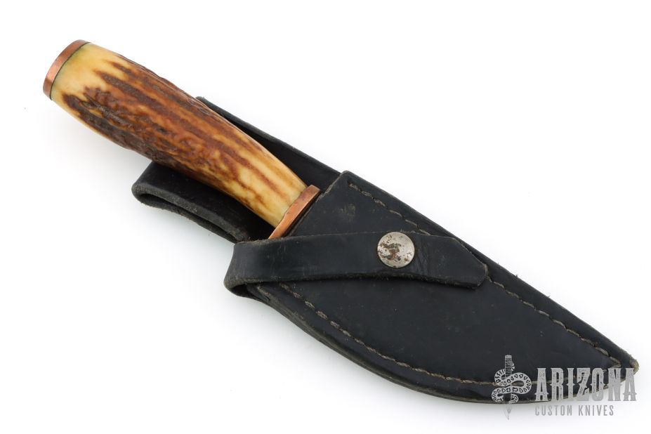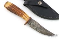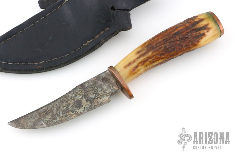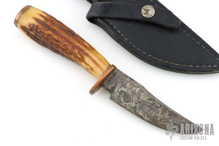 This Hunter by Floyd E Medlin features a clip point blade with a forced patina finish, .266" blade stock and 1.314" blade depth, hidden tang construction. The handle has brass guard and butt with a stag grip. Comes with a black leather sheath. Has some light oxidation, otherwise good condition.