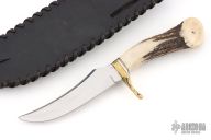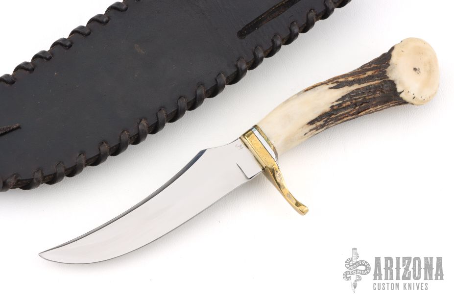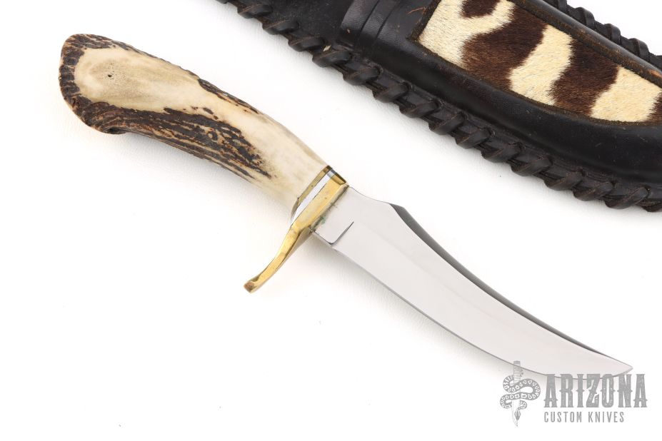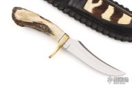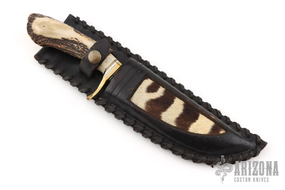 This knife features a mirror polished blade with false top edge, .173" blade stock and 1.164" blade depth, hidden tang construction. The handle has a brass guard, crown stag grip with aluminum and brass spacers. Comes with a black leather sheath with exotic skin inlay. Has scratches, otherwise good condition. It has what looks to be "JH" on the blade. Please let us know if you know who this is.