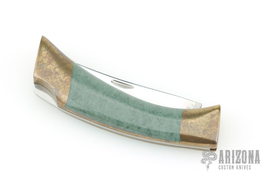 This Great Divide Jade Knife by Browning features a polished blade with nail nick. The handle is comprised of dovetailed brass double bolsters with integral liners and Nephrite jade scales, and a stainless steel lock back. Includes original wooden display case. Has some light patina, otherwise excellent condition. This knife is #1965 of 2000 that were made.