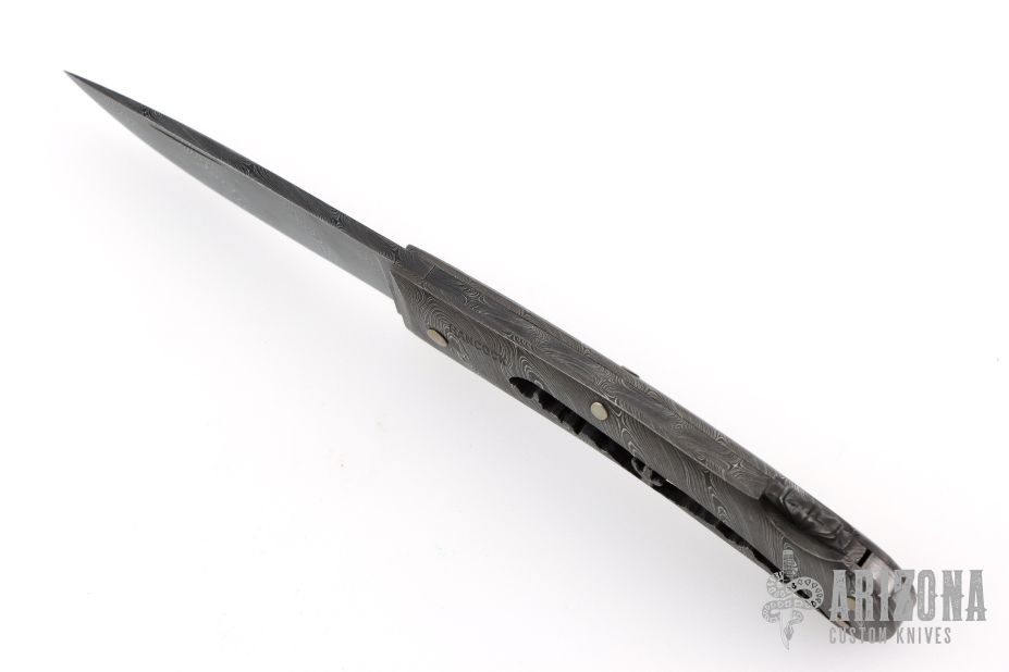 This lockback folder from Master Smith Tim Hancock features a Damascus blade with nail nick. The handle has a full Damascus frame, Damascus lockbar with scalloped and fileworked lock release, hand peened nickel silver pins. Nice lockup and blade seating. The front of the frame has "HANCOCK" etched, and the back has "M.S." etched. Excellent condition.
