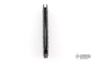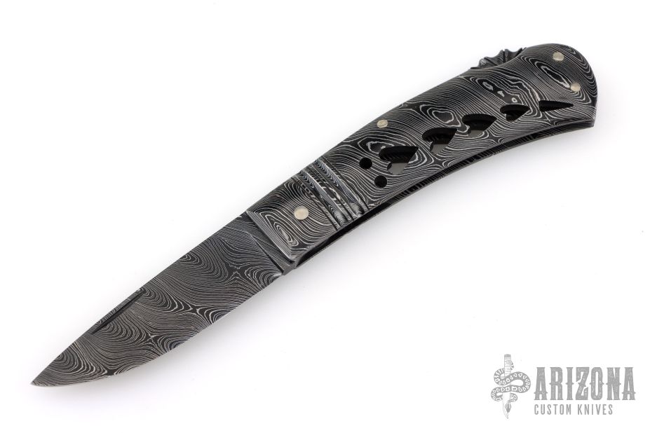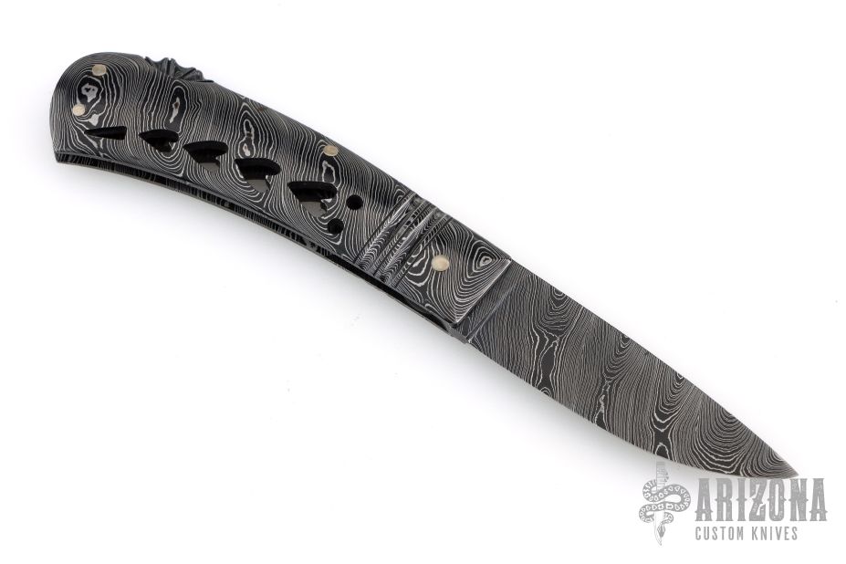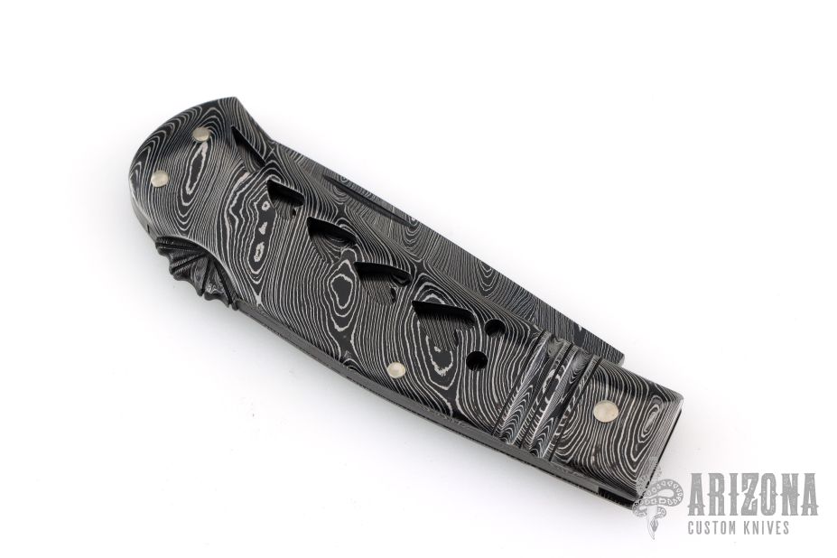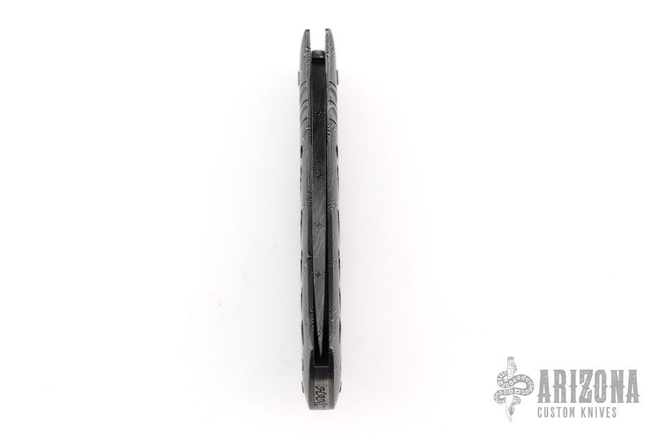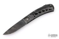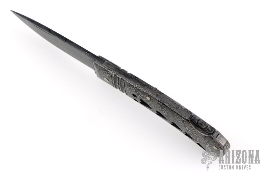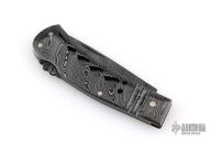 This lockback folder from Master Smith Tim Hancock features a Damascus blade with nail nick. The handle has a full Damascus fluted frame, Damascus lockbar with scalloped and fileworked lock release, hand peened nickel silver pins. Nice lockup and blade seating. The butt of the frame has "HANCOCK" etched, and the inside of the backspacer has "19M.S.95" etched. Has a couple very light scuffs, and a couple very small oxidation spots, otherwise excellent condition.