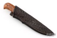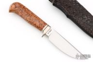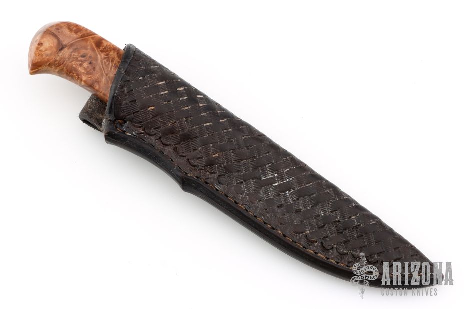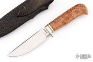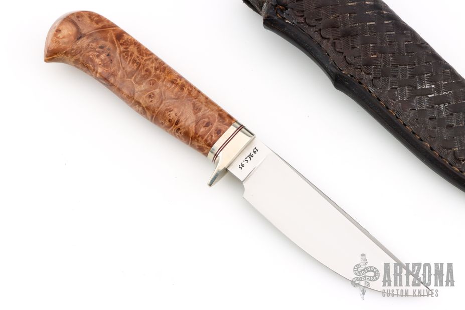 This hunter by Master Smith Tim Hancock features a hand rub satin finished blade with visible hamon and a false top edge, .146" blade stock and 1.082" blade depth, hidden tang construction. The handle has a nickel silver guard with black spacers, and a nicely contoured stabilized maple burl grip. Comes with a hand tooled black leather sheath and a zippered case. Dated 1995 on the blade. Has a few extremely light scratches, otherwise excellent condition.